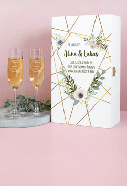 Auch Geschenksets zur Hochzeit hinterlassen einen bleibenden Eindruck. Derzeit beliebt ist beispielsweise unser Maybach-Weißweinset mit gravierten Weingläsern und bedruckter Geschenkbox zur Hochzeit.