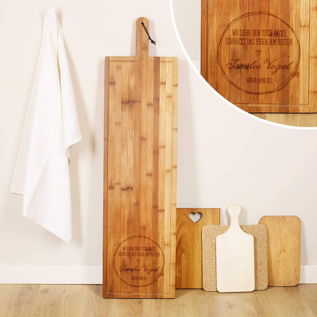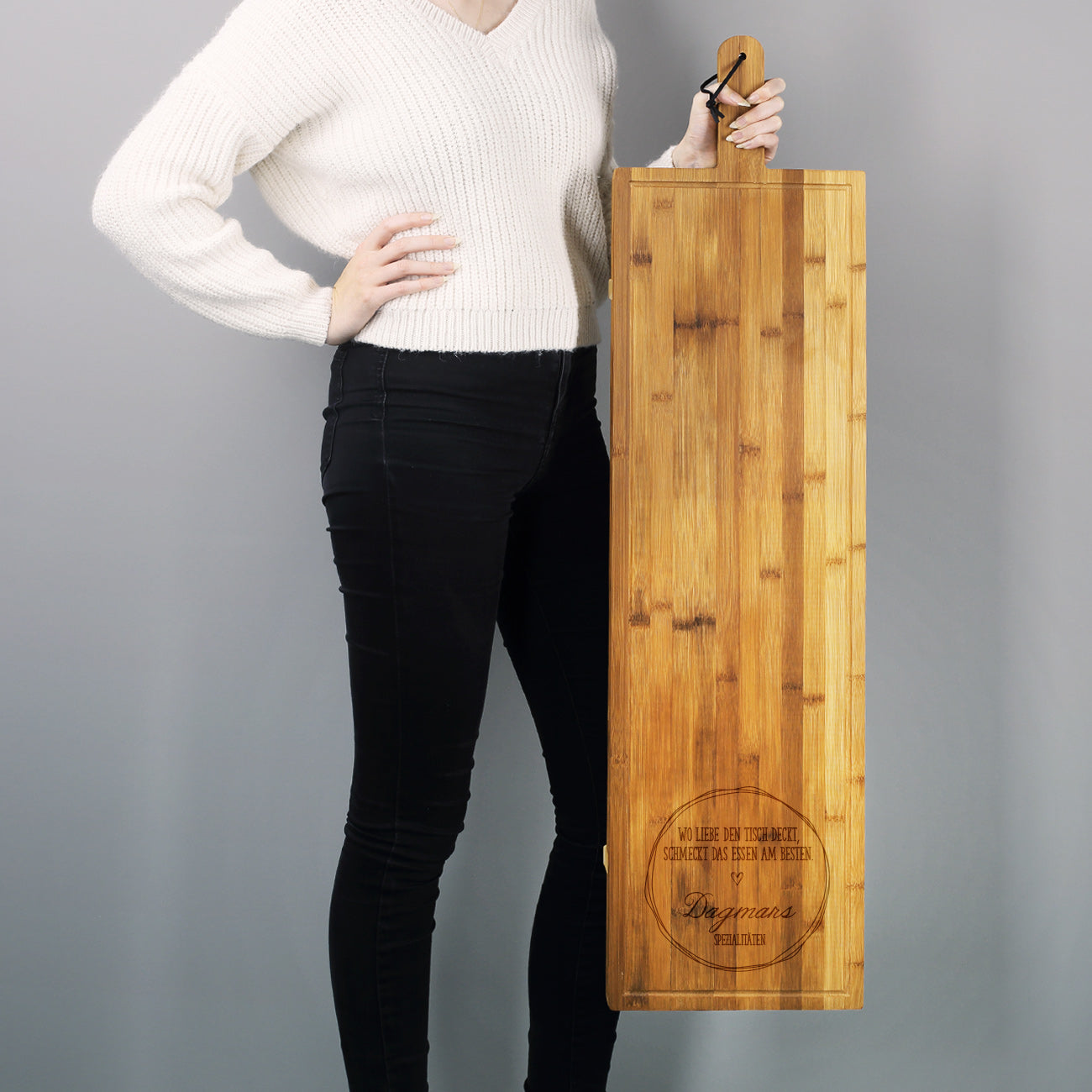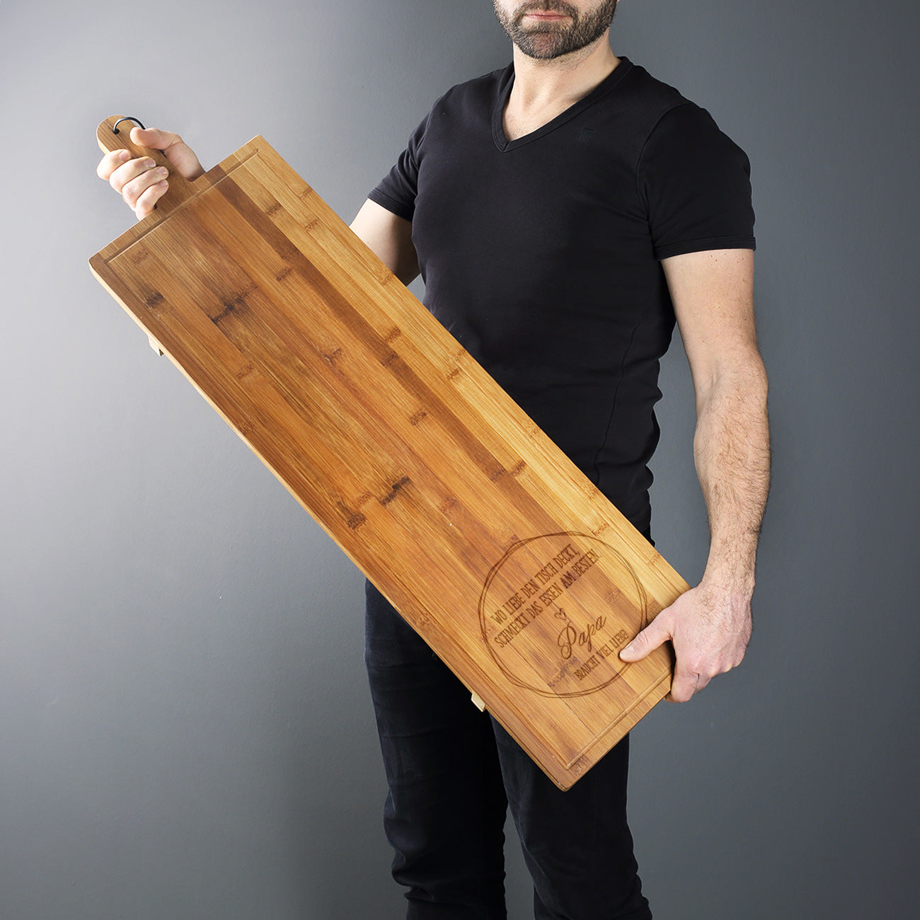 Natürlich fällt das Bambusbrett schon alleine durch die Größe besonders auf, aber das Highlight darauf ist noch immer die personalisierte Gravur nach Ihrem Wunsch. Neben dem Schriftzug "Wo die Liebe den Tisch deckt, schmeckt das Essen am besten" werden noch zwei Zeilen Text nach Ihrem Wunsch graviert. Diese können beispielsweise Namen, eine Botschaft oder Glückwünsche sein - je nachdem für wen das Bambusbrett gedacht ist und zu welchem Anlass Sie es verschenken wollen. Beispiele und Inspirationen können Sie aus unseren Produktbildern entnehmen.