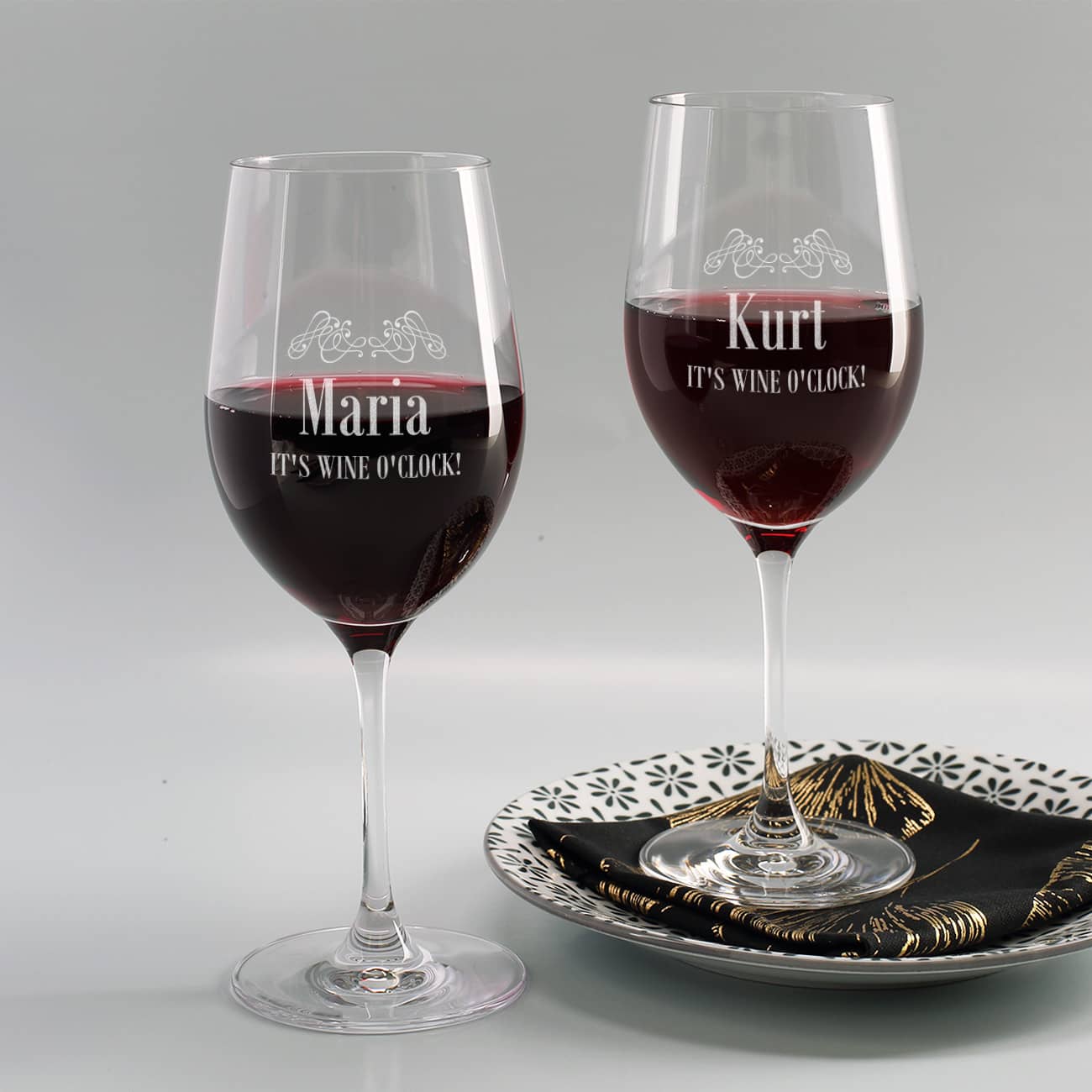 Zwei Weingläser mit Namen personalisiert. Ob nach einem stressigen Tag, zum Beginn des Wochenendes, zum Geburtstag als Geburtstagsgeschenk, Weihnachtsgeschenk oder als Geschenk zum Valentinstag - mit diesen persönlich gravierten Weingläsern ist es immer genau die richtige Zeit für einen guten Tropfen. Verziert mit einem kleinen Ornament kommen die IT'S WINE O'CLOCK Gläser im Set zu Ihnen nach Hause. Verschenken Sie diese individuellen Gläser auch an ein Paar als Hochzeitsgeschenk. In der Vitrine des Paares werden diese eine schöne Erinnerung an den Hochzeitstag darstellen.