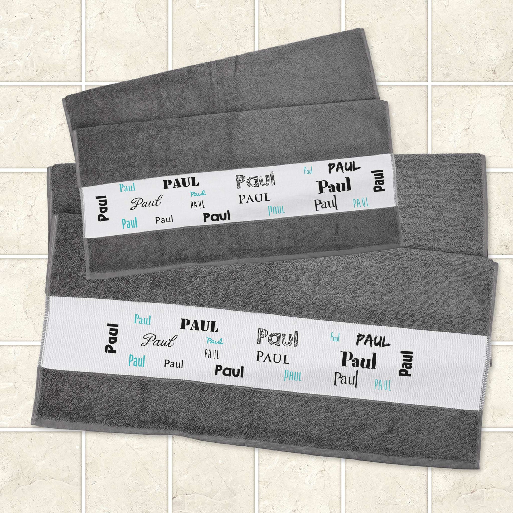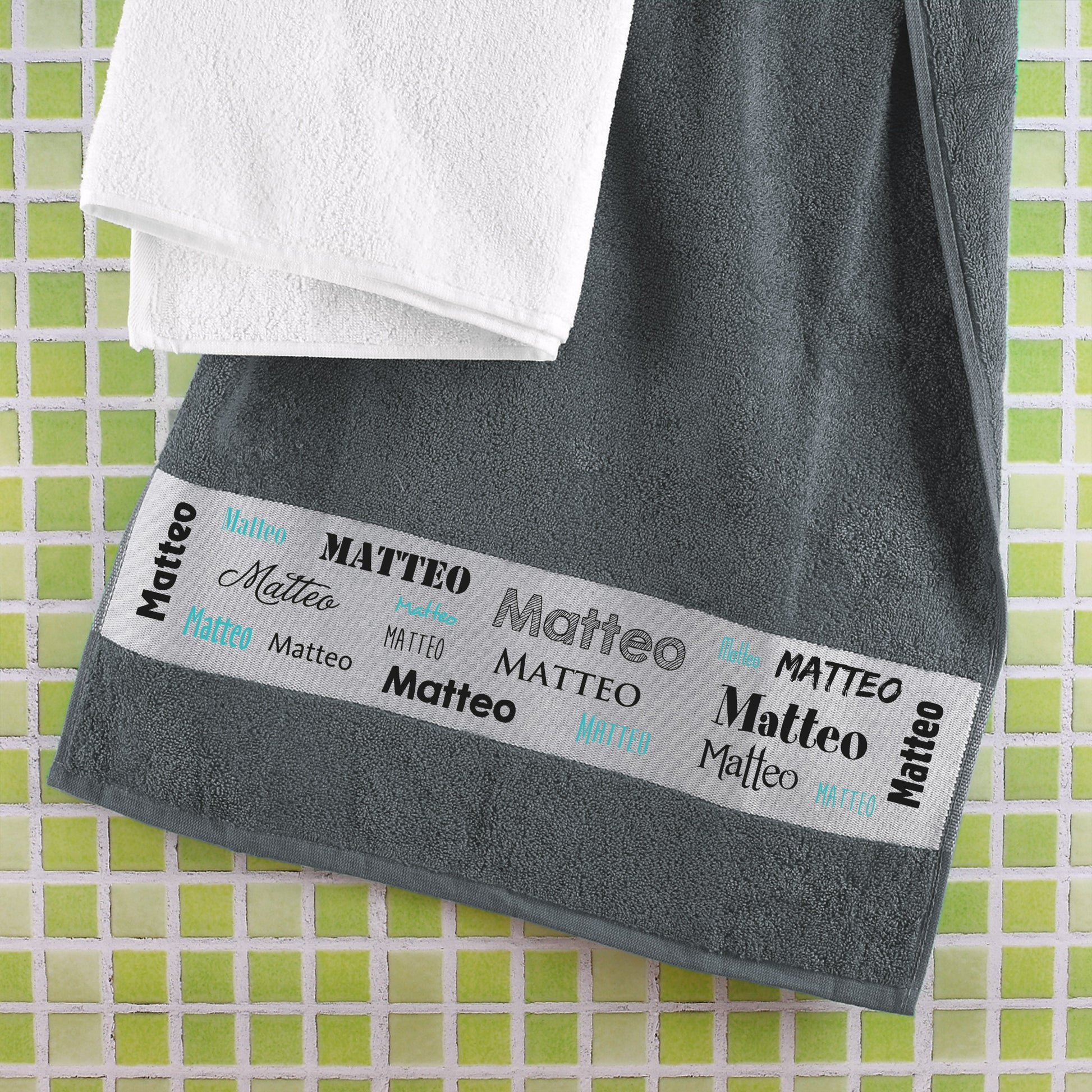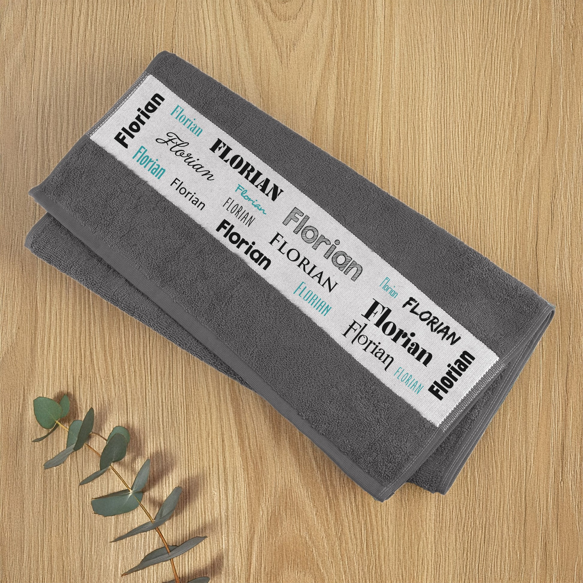 Ein hochwertiges Geschenk mit Ihrem gewünschten Namensaufdruck ist dieses graue, flauschig weiche Badetuch. Der einseitige Aufdruck besteht aus Ihrem gewünschten Namen in verschiedenen Schriftarten und den Farben schwarz und türkis.