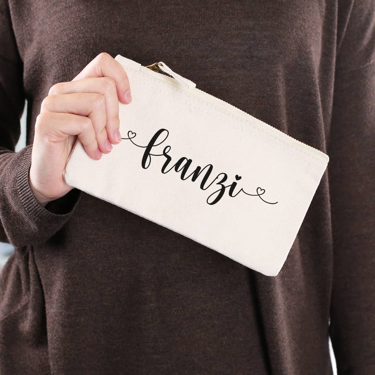 Mit unserem bedruckten Beautycase in 5 Farben und zwei Größen können Sie Ihrer besten Freundin, Schwester, Mama oder Arbeitskollegin eine riesige Freude machen. Für die geschwungenen Herzen vor und nach dem Namen bitte das + in das Namensfeld eingeben. Beispiel: +Melanie+. So kreieren Sie ein personalisiertes Geschenk, das schön und gleichzeitig nützlich ist. Mit dem Beautycase geht in der Handtasche und dem Reisegepäck nichts verloren und alles Wichtige bleibt am Platz. Seien es kleine Haargummis, Stifte, Schminke und andere Kosmetik oder die Schlüssel - hiermit ist alles was man braucht schnell zur Hand.