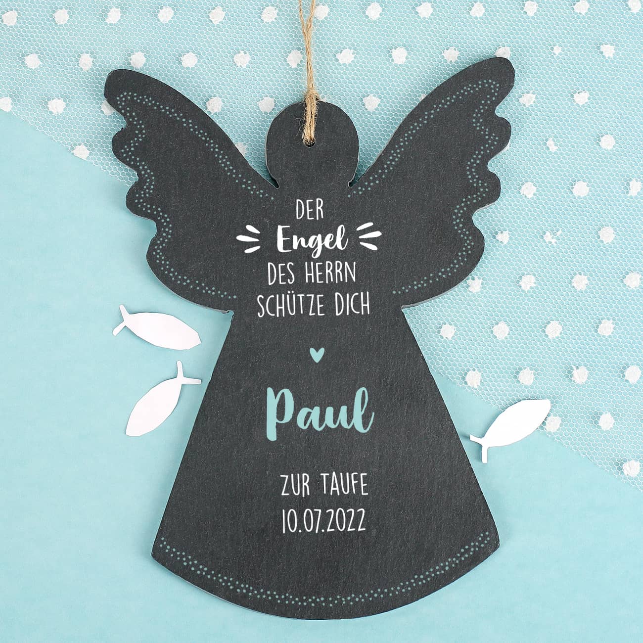 Der Engel wird einseitig mit dem Namen des Kindes, dem entsprechende Datum und dem Anlass der Schenkung bedruckt. Ergänzt werden diese persönlichen Angaben mit dem Spruch "Der Engel des Herrn schütze dich". Der 20 cm hohe Engel aus Schiefer wird mit einem Band für die Wandbefestigung ausgeliefert. Er ist ein himmlischer Beschützer im Kinderzimmer und ein sehr schönes Geschenk zu religiösen Anlässen.