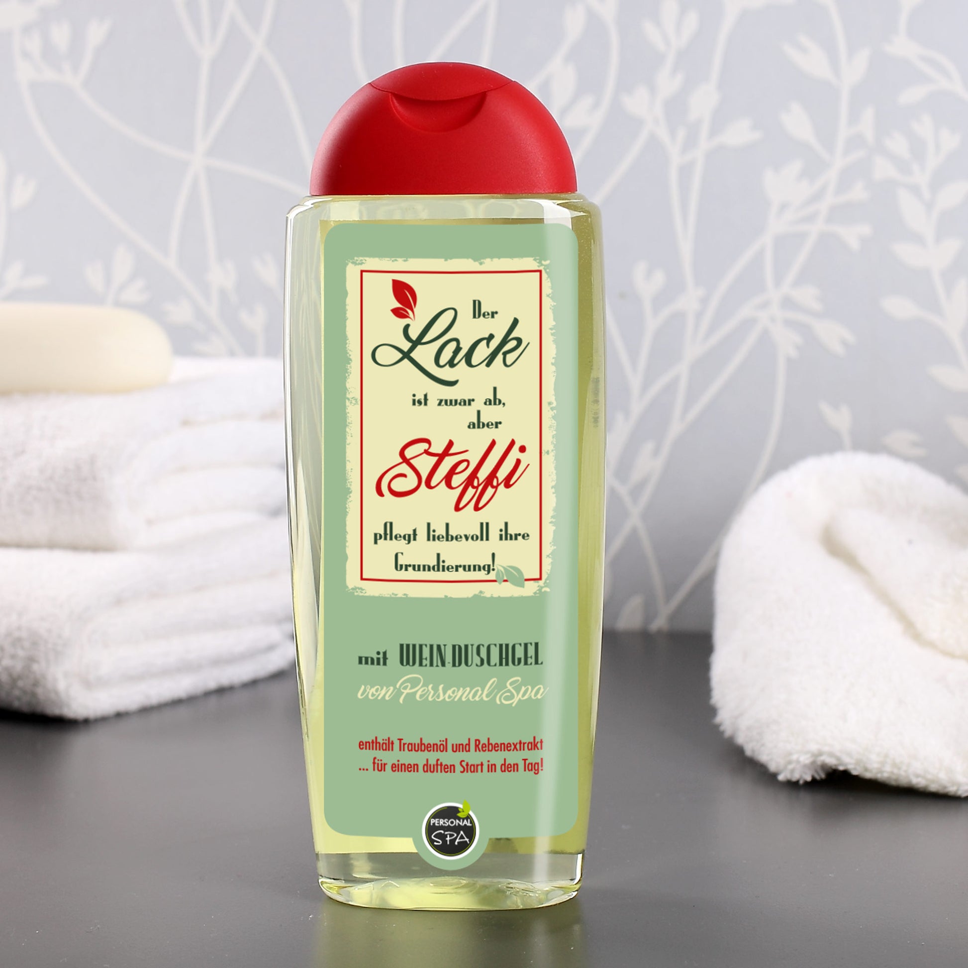 Das Weinduschgel aus der Serie Personal Spa besitzt neben dem lustigen Etikett besonders pflegende Rohstoffe der Weinreben. Sie schützen die Haut auf sanfte Art und Weise - genau das Richtige für die reife Haut.