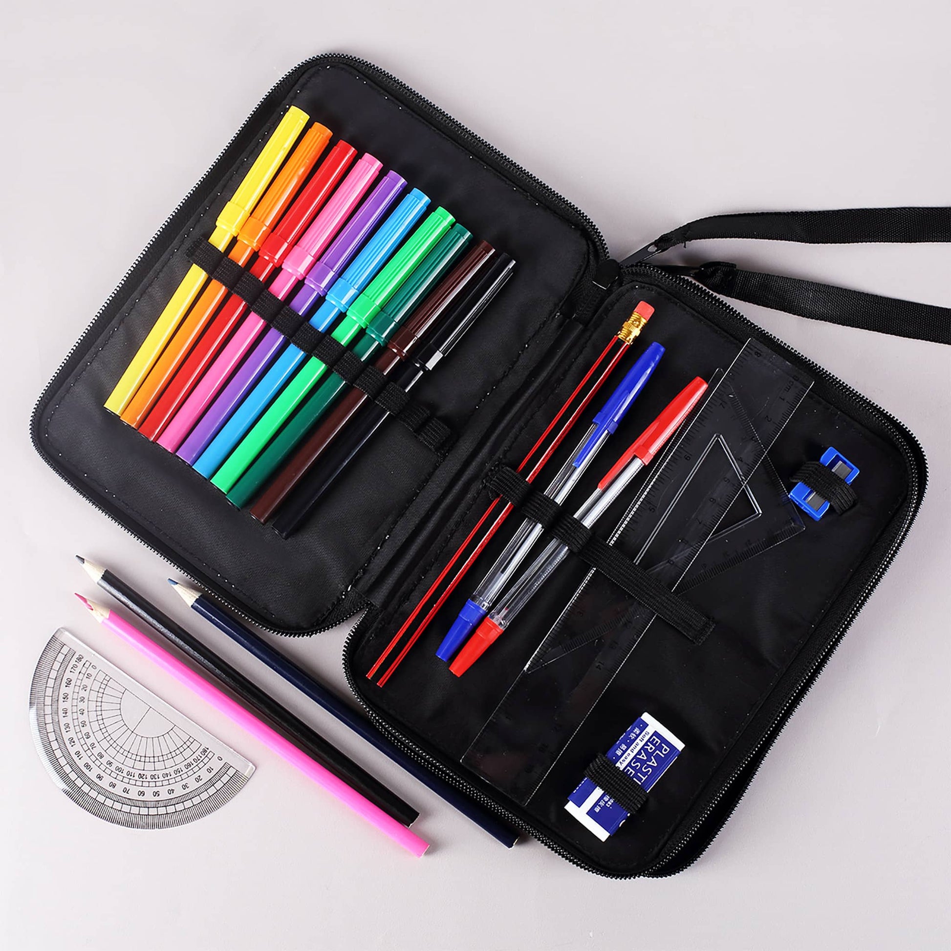 - Federmappe mit Stiften gefüllt (12 Buntstifte, 10 Filzstifte, 1 Bleistift, 1 Radiergummi, 1 Anspitzer, 2 Lineale, 2 Dreiecke, 1 Winkelmesser und 2 Kugelschreiber)