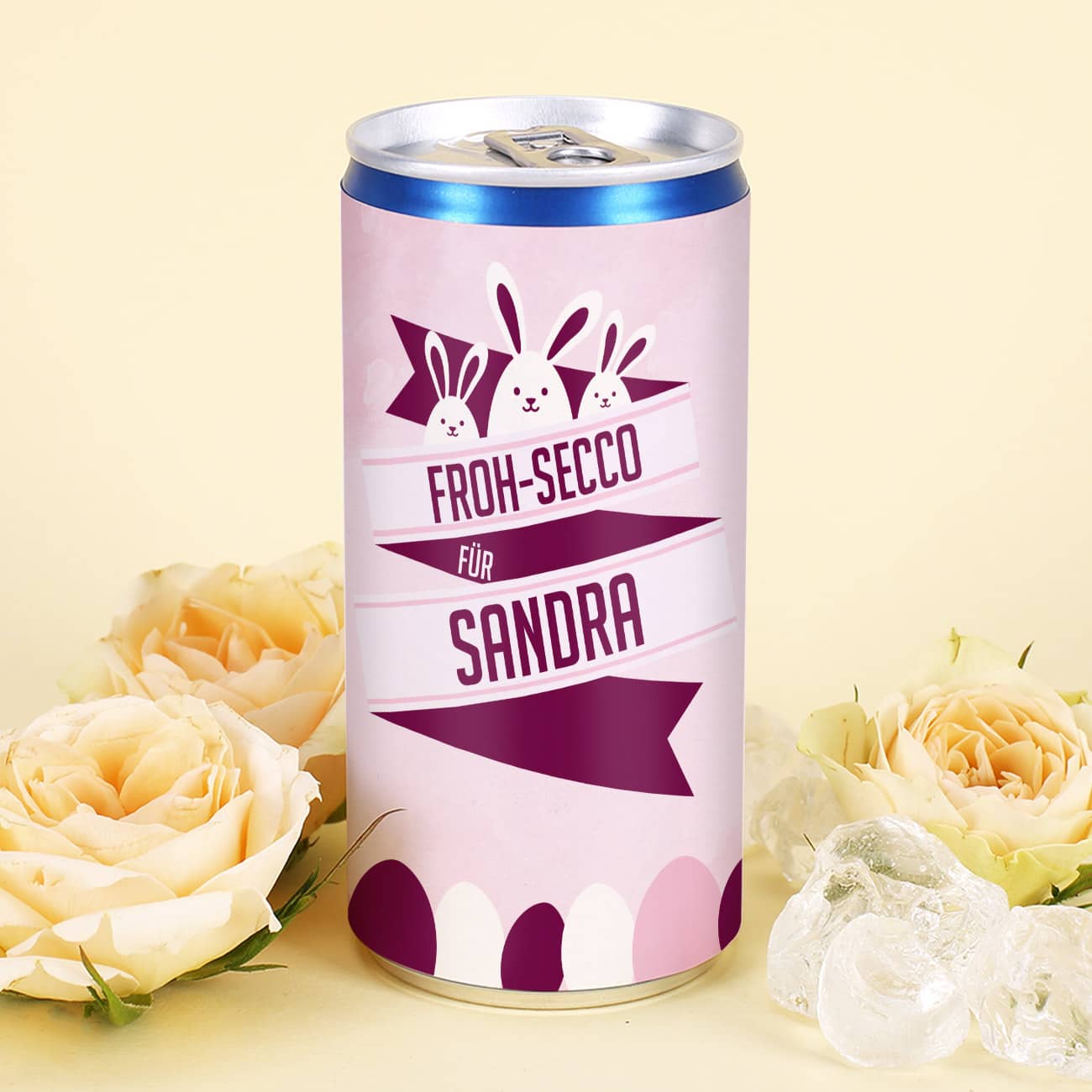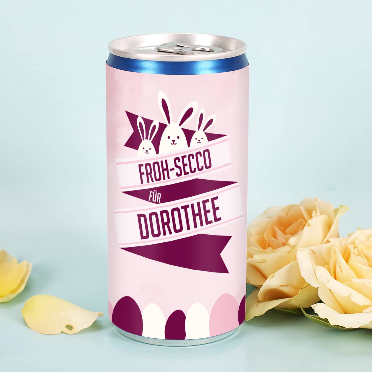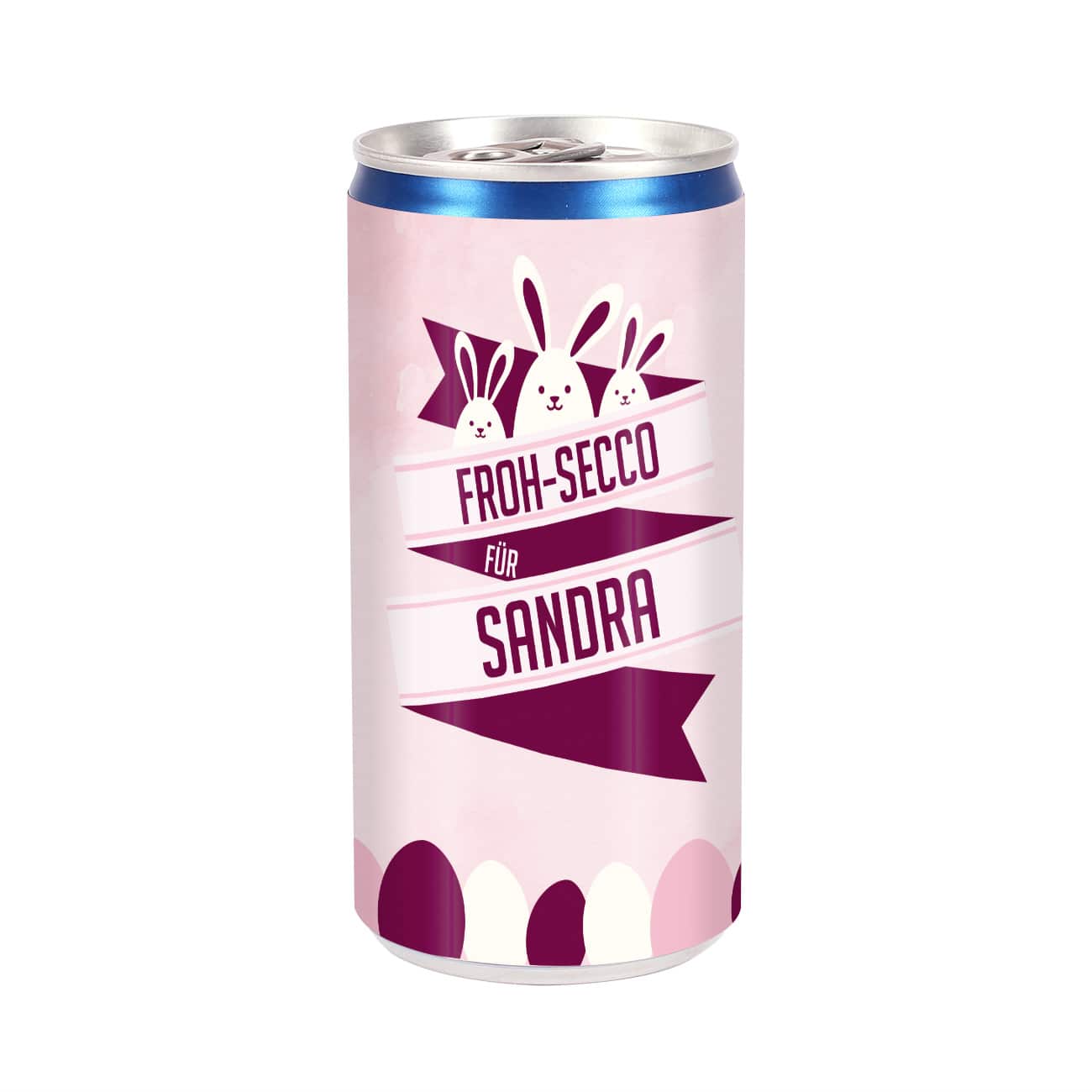 Die Seccodose wird von uns mit einer personalisierten Banderole beklebt. Das rosane Motiv mit den drei Häschen passt perfekt zu Ostern. Unten schließt eine Reihe Ostereier das Motiv ab. Das Banner mit dem festen Text "Froh-Secco für" und Ihrem Wunschnamen macht den Secco zu einem persönlichen Ostergeschenk. Die perfekte Kleinigkeit um mal wieder mit der besten Freundin oder Arbeitskollegin anzustoßen. Das perfekte Ostergeschenk für Frauen oder für Männer!