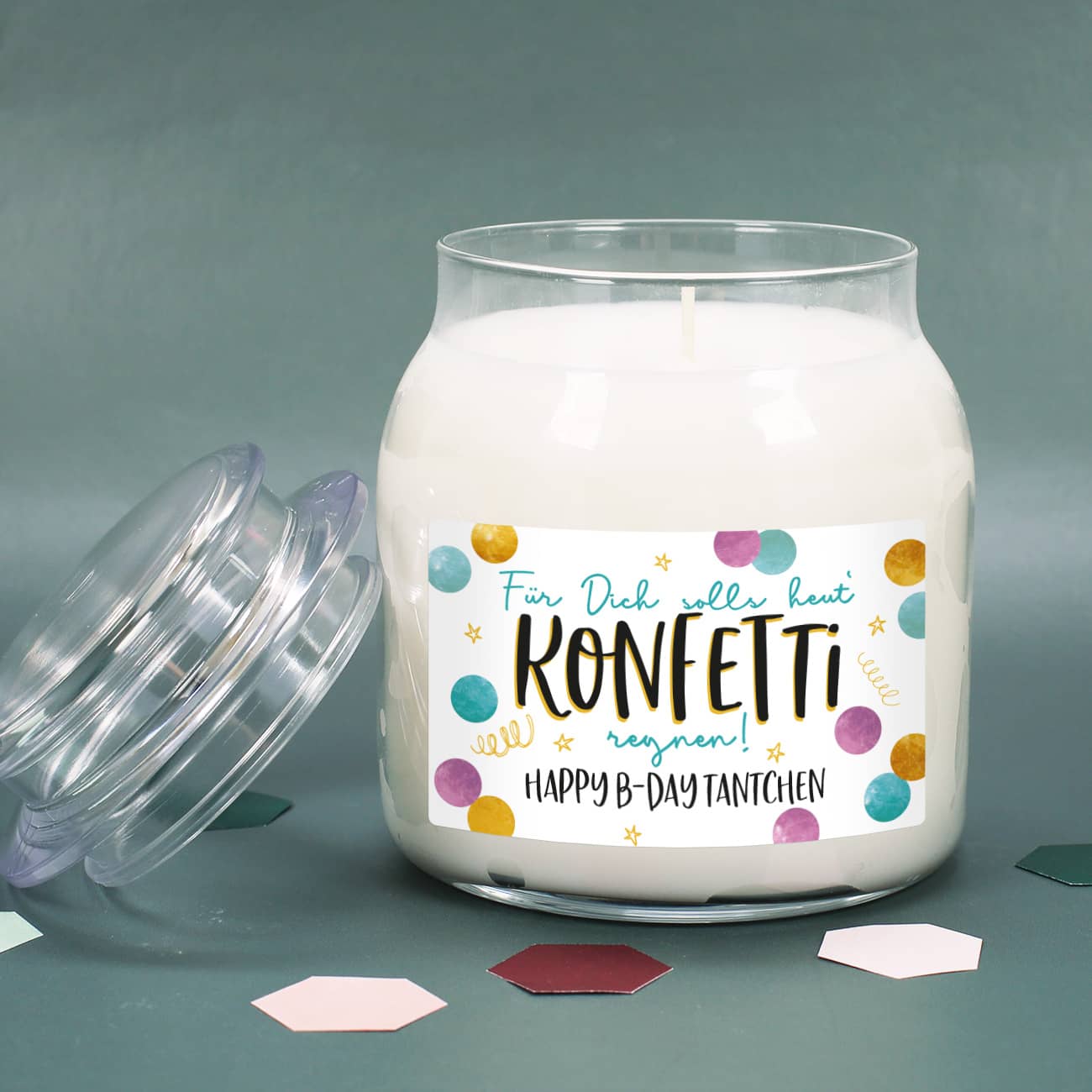Sie suchen noch eine Kleinigkeit zum Geburtstag? Mit dieser hübschen Duftkerze machen Sie dem Geburtstagskind sicher eine Freude. Die Kerze bekommt von uns ein persönlich gestaltetes Etikett mit dem Spruch "Für Dich solls heut' Konfetti regnen!" und Ihrem Text nach Wunsch darunter. Hier können Sie Ihre eigenen Glückwünsche auf der Duftkerze verewigen und somit ein personalisiertes Geschenk zum Ehrentag überreichen. Das bunte Konfetti auf dem personalisierten Etikett wird bei Erhalt garantiert für eine fröhliche Laune sorgen können. Nicht nur am Geburtstag kann es mit Konfetti regnen, sondern auch zu anderen Anlässen, an denen etwas gefeiert werden kann. Da der Text ganz nach Wunsch ergänzt werden kann, können Sie die Duftkerze auch als Geschenk zum Schulabschluss, für das erfolgreiche beenden des Studiums oder für einen anderen Erfolgsmoment überreichen.
