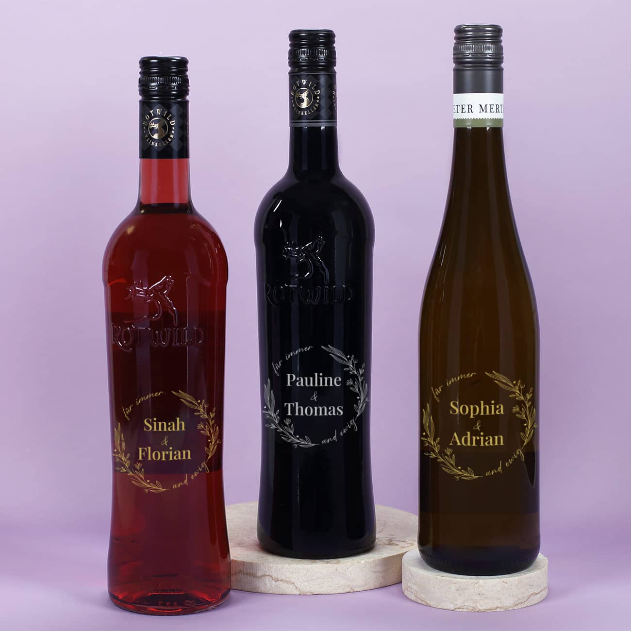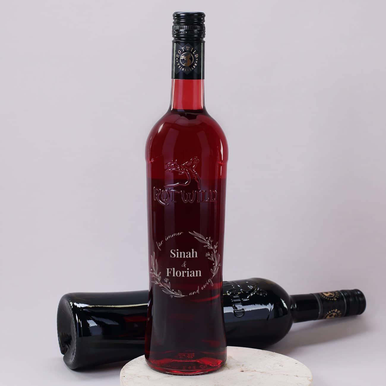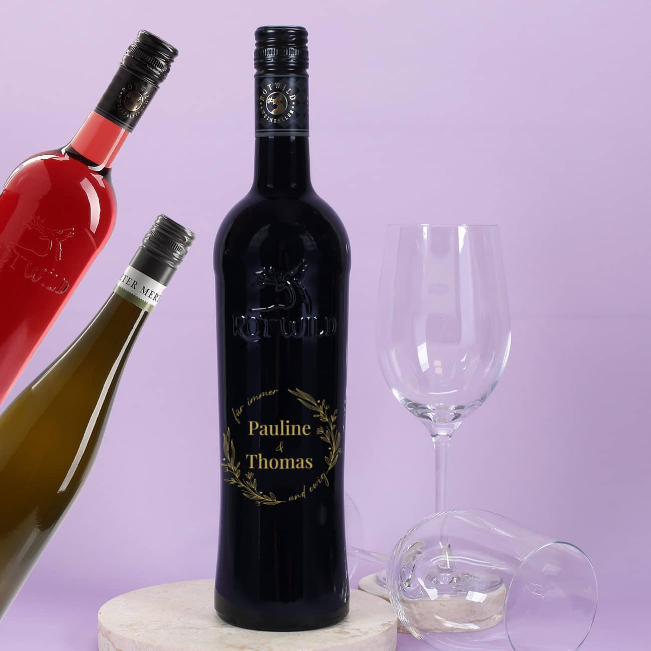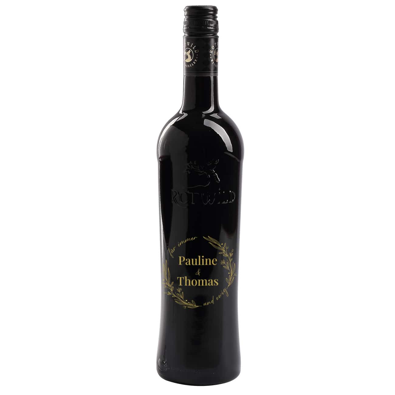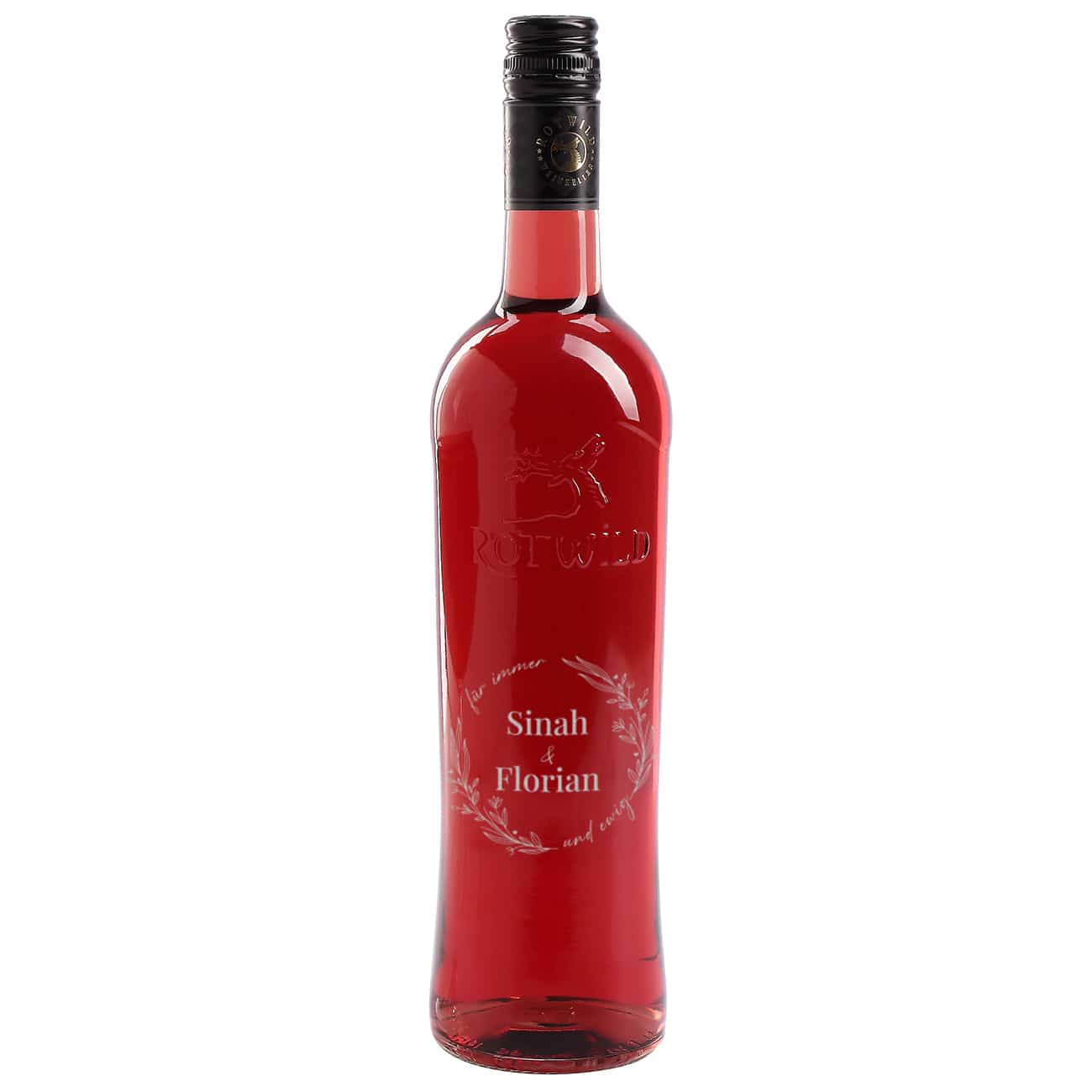 Weinflasche zur Hochzeit mit - Für immer und ewig - und Namen graviert