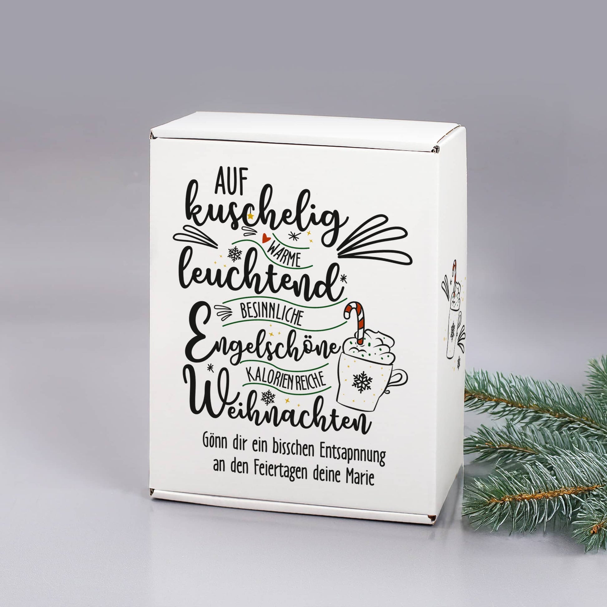 Das personalisierte Tee Geschenkset zu Weihnachten mit dem lustigen und zugleich herzerwärmenden Schriftzug "Auf kuschlig warme, leuchtend besinnliche, engelschöne, kalorienreiche Weihnachten" ist das perfekte Geschenk für die kalte Jahreszeit. Diese humorvolle Botschaft wird auf der Geschenkverpackung mit einem Text nach Wunsch ergänzt und macht dieses Set zu einem originellen Weihnachtspräsent. Verschenken Sie dieses Geschenkset an Freunde, Familie oder Kollegen direkt zu Weihnachten und überreichen Sie warme und leckere Freuden!