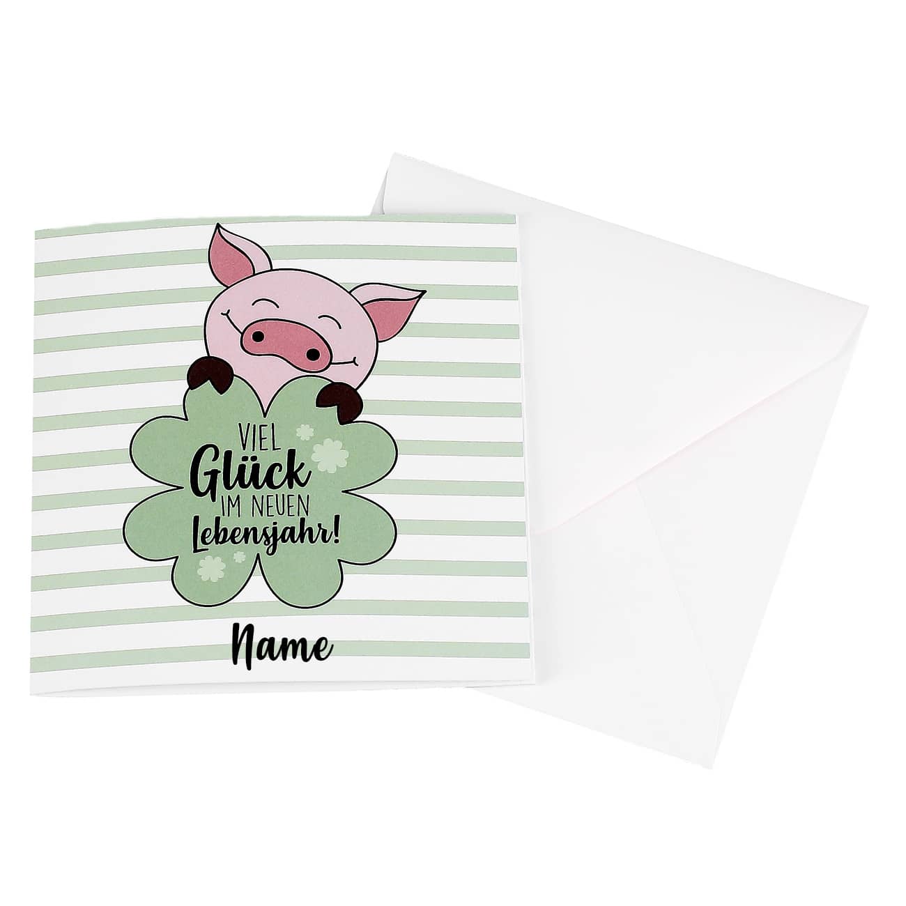 Vorne ist die Karte mit dem Spruch "Viel Glück im neuen Lebensjahr!" einem Glücksschweinchen und Kleeblättern bedruckt. Unter dem Motiv platzieren wir Ihren Wunschnamen. Im Inneren besitz die Karte einen vorgefertigen Schlitz in dem Sie Geldscheine oder auch die handelsüblichen Gutscheinkarten platzieren können. Damit die Karte noch persönlicher wird, haben wir Innen Platz gelassen für ene Grußbotschaft Ihrerseits. Hier können Sie Ihre Glückwünsche verewigen. Für Ihren Wunschtext stehen Ihnen maximal 180 Zeichen zur Verfügung.
