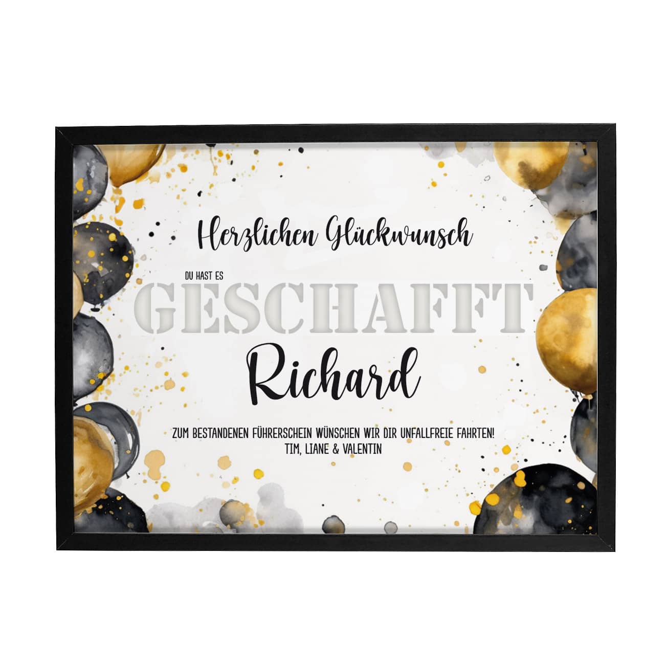 Verleihen Sie Ihrem Geschenk eine persönliche Note mit dem Namen des Empfängers oder der Empfängerin und zwei Zeilen Text für individuelle Glückwünsche. So wird der Bilderrahmen zu einem unvergesslichen Erinnerungsstück, das den Erfolg und die Unterstützung von Familie und Freunden symbolisiert. Egal ob herzliche Glückwünsche, ein inspirierender Spruch oder ein persönlicher Gruß – Ihre Worte machen den Rahmen einzigartig. Der Bilderrahmen wird als Komplett-Set geliefert, das sowohl den Rahmen als auch das passende Poster beinhaltet. Der Rahmen ist in den Farben Schwarz oder Natur erhältlich, was ihm eine elegante und zugleich zeitlose Optik verleiht. Der Ausschnitt für Geldscheine ist praktisch und leicht zu handhaben, sodass Sie das Geschenk schnell und unkompliziert vorbereiten können.