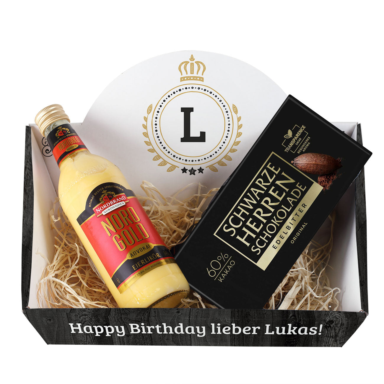 - Diese Variante umfasst schwarze Herren Täfelchen (150g) sowie einen 350ml Eierlikör, eine klassische Kombination für anspruchsvolle Gaumen.