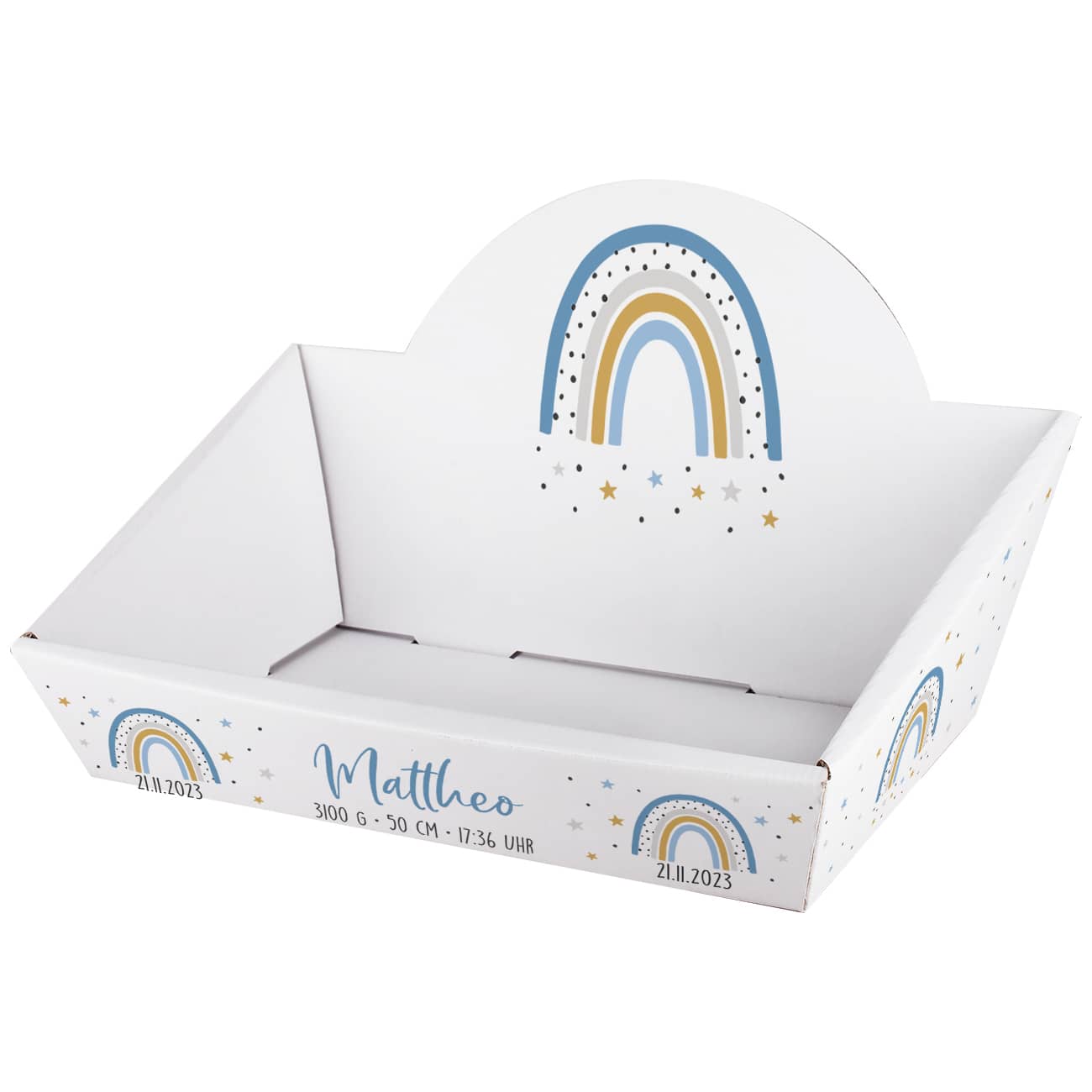 Der Geschenkkorb besteht aus hochwertigem Karton, der umlaufend bedruckt ist. Nach dem Auspacken kann der Korb als praktische Aufbewahrungsbox für Babyutensilien verwendet werden. Das personalisierte Design mit Regenbogenmotiv macht ihn außerdem zu einer bleibenden Erinnerung an diesen besonderen Tag. Mit einer schnellen Lieferung ist dieses Geschenk perfekt für frischgebackene Eltern, die Sie überraschen und unterstützen möchten.