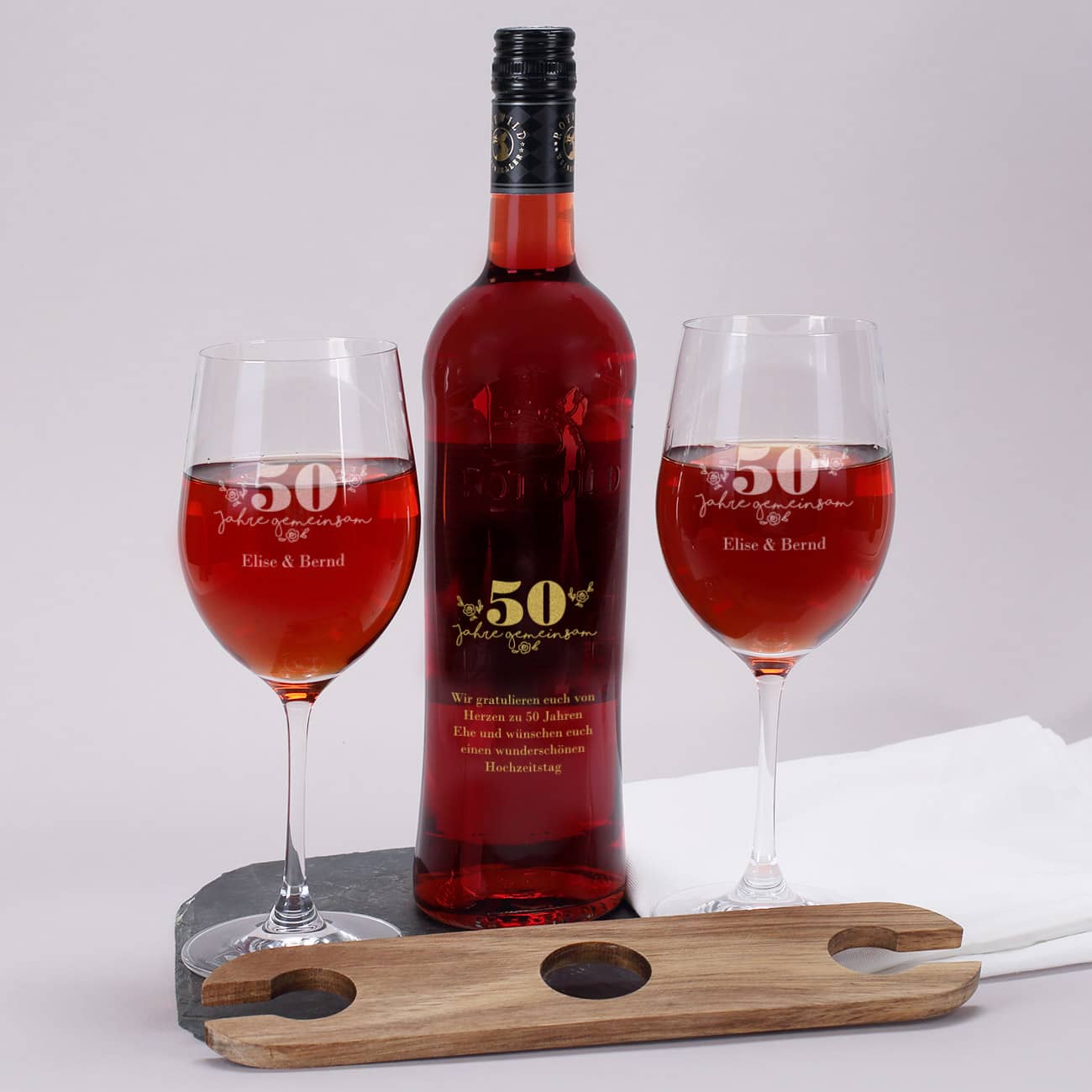 Wein-Geschenkset mit Weinbutler, Weingläsern und gravierter Weinflasche