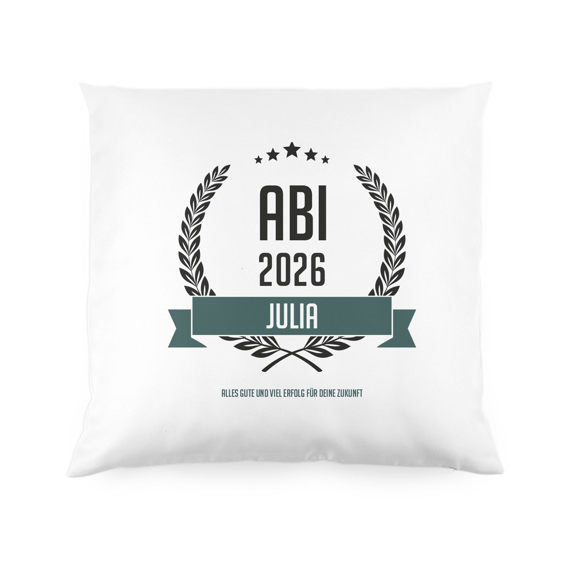 Das weiche, weiße Kissen zum Abitur wird einseitig mit einem Ährenkranz dem Schriftzug ABI und Ihrem gewünschten Namen bedruckt. Hinzu kommt Ihr selbst verfasster Text für Glückwünsche. Fertig ist ein cooles Wohnaccessoire für den glücklichen Schulabgänger.