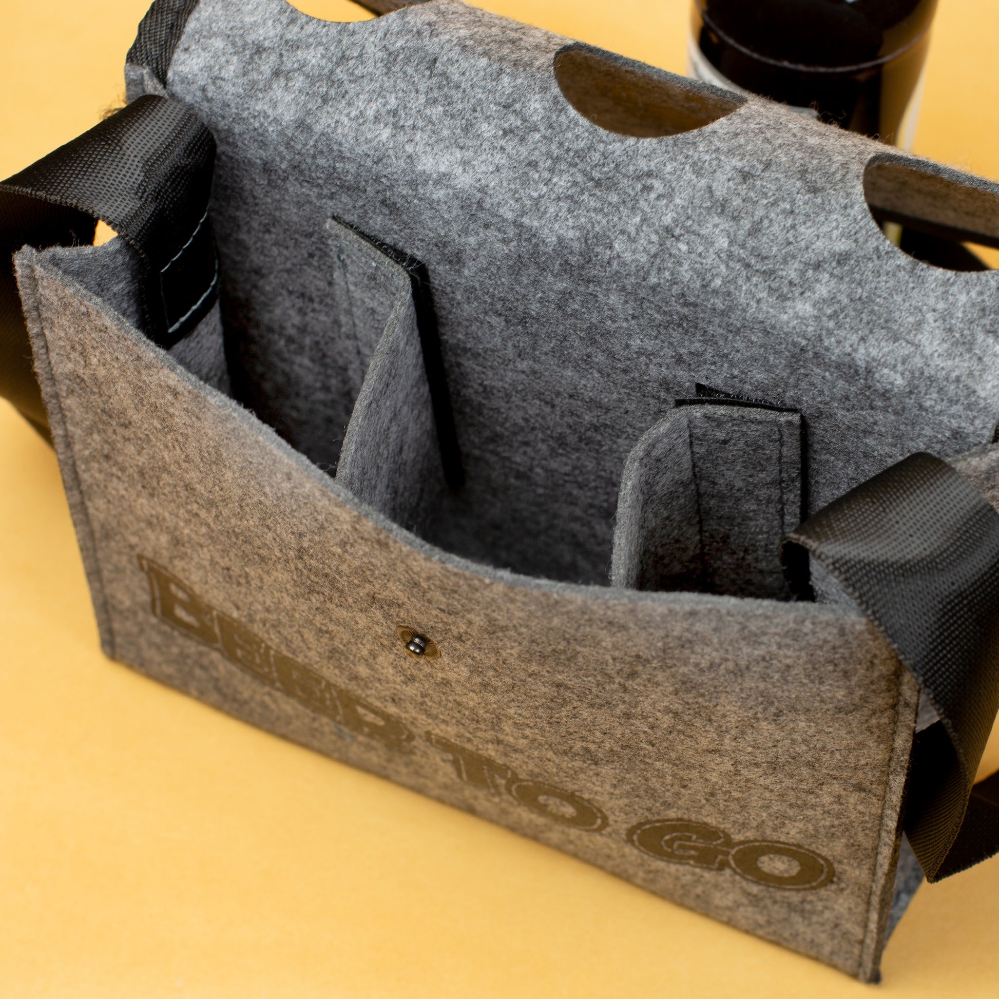 Die Tasche bietet Platz für drei 0,33-l-Bierflaschen, die durch integrierte Trennfächer im Inneren stabil voneinander getrennt stehen. Der praktische Klappdeckel mit Druckknopf verschließt die Tasche zuverlässig und schützt den Inhalt beim Tragen. Die runden Öffnungen im oberen Bereich sind passgenau auf Flaschenhälse ausgelegt und sorgen dafür, dass die Flaschen sicher sitzen und beim Transport nicht verrutschen.