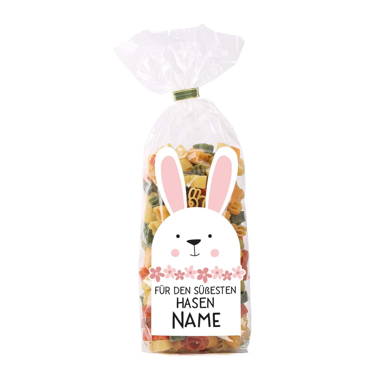 Unsere bunten Nudeln in Hasenform sind die perfekte Kleinigkeit zum Fest. Die Packung wird mit einem großen Hasenaufkleber verziert. Darauf steht der Text "Für den süßesten Hasen" zusammen mit Ihrem Wunschnamen. Mit unserer Produktvorschau können Sie Ihre Eingabe vor der Bestellung noch einmal überprüfen.