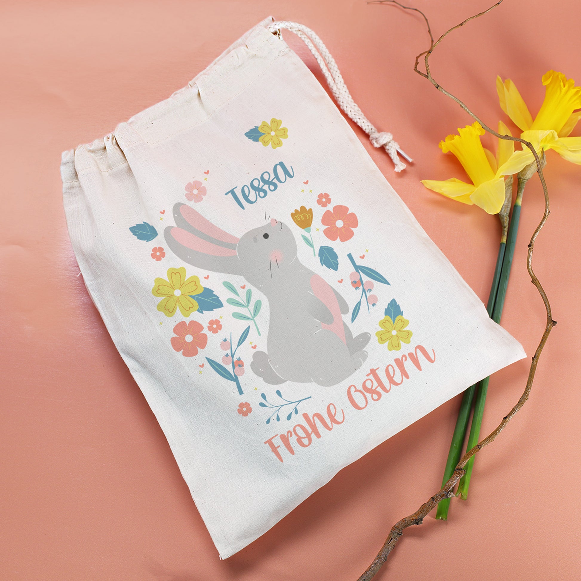 Individueller Osterbeutel mit niedlichem Hasen, Blumen & Wunschname