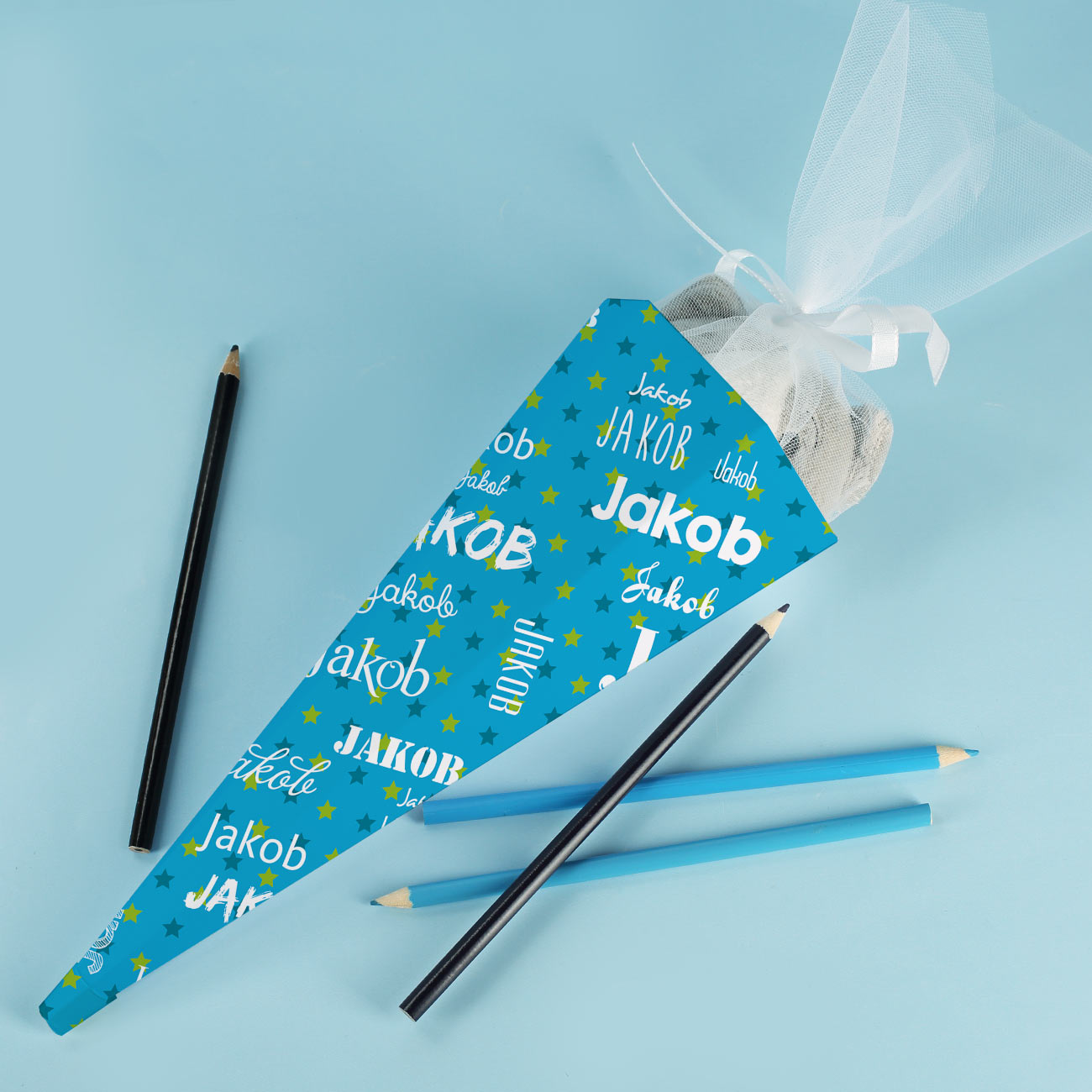 In diese kleine Zuckertüte passen so allerlei Materialien, die ein Schulanfänger gebrauchen könnte, sei es ein Radiergummi, Buntstifte oder ein Lesezeichen, alles findet hier seinen Platz. Auch Süßigkeiten können darin verstaut werden, damit Ihr Kind nach den Schulstunden ein wenig Nervennahrung hat, um danach noch die Hausaufgaben zu erledigen. Die Tüte ist blau bedruckt mit vielen kleinen gelb-grünen und dunkelblauen Sternchen, darauf befindet sich Ihr Name in verschiedenen Schriftarten, damit die Tüte nicht so leicht zu verwechseln ist. In liebevoller Handarbeit wird die kleine Schultüte von uns zusammen gebastelt und in Form gebracht. Mit einem Nylontüll, der von innen befestigt ist, lassen sich die Geschenke gut verpacken.