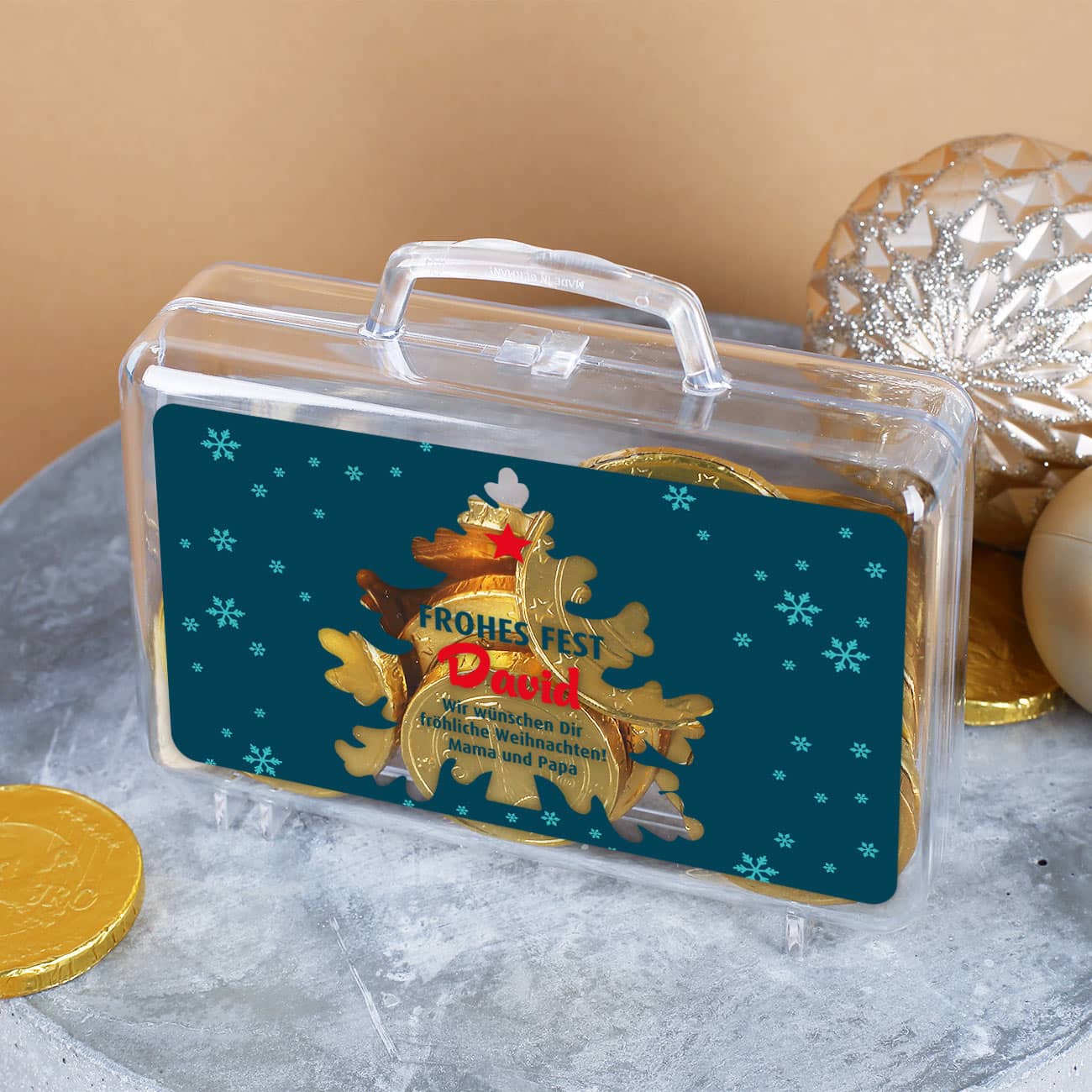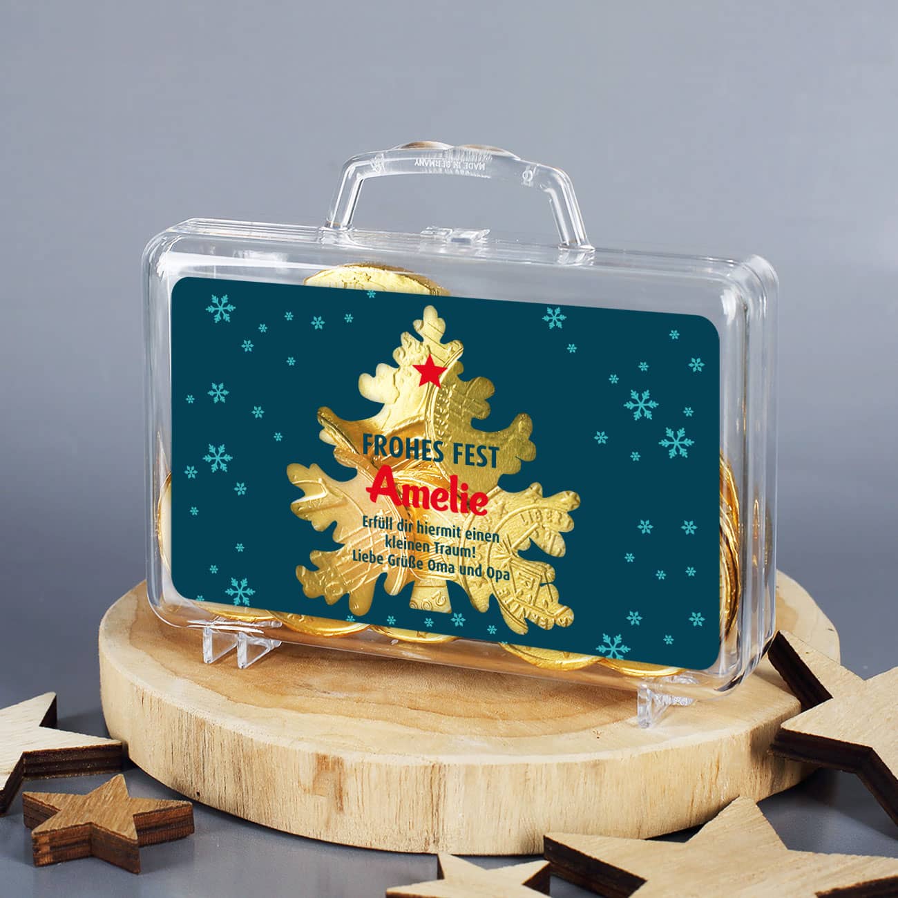 Der kleine Geldkoffer aus transparentem Kunststoff wird mit dem Spruch Frohes Fest, Ihrem Wunschnamen und ihrem Wunschtext bedruckt. Dabei erscheint der Text in einer Tannenbaum-Silhouette, durch welche Sie einen Einblick in das Kofferinnere haben.