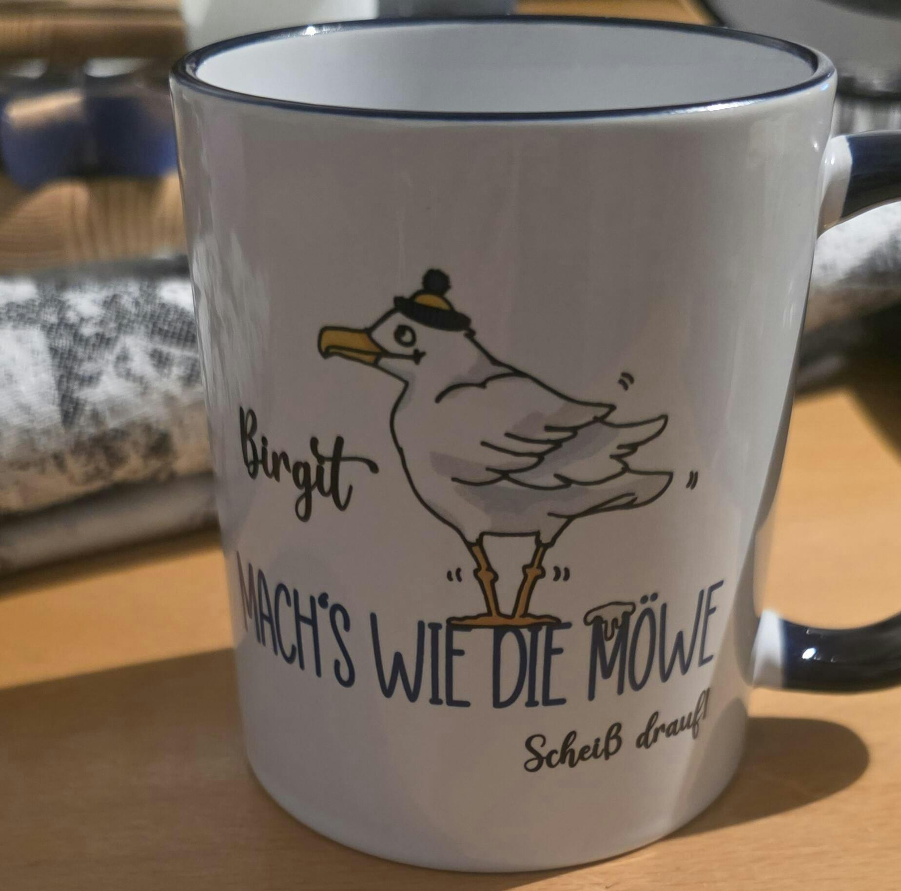 Mach's wie die Möwe... - Tasse mit Name und dunkelblauem Henkel
