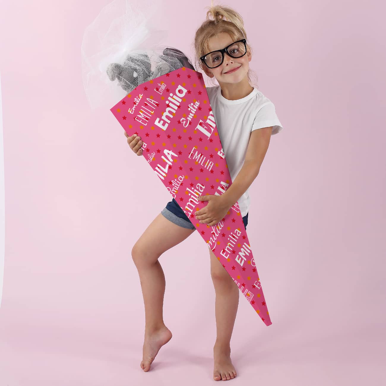Diese 80 cm hohe Exemplar mit weißem Tüllverschluss fällt garantiert aus dem Rahmen des bunten Schultüten-Angebots. Sie besitzt einen vergleichsweise dezenten Hintergrund in Rosa mit kleinen Sternen in Orange und Rot. Das Besondere an diesen sechseckigen Schultüten ist jedoch der umlaufende Namensaufdruck in ganz verschiedenen Schriftarten. Mit dieser außergewöhnlichen Zuckertüte präsentiert sich Ihre Schulanfängerin sich sehr stolz in der Schule und auf den Familienfotos.