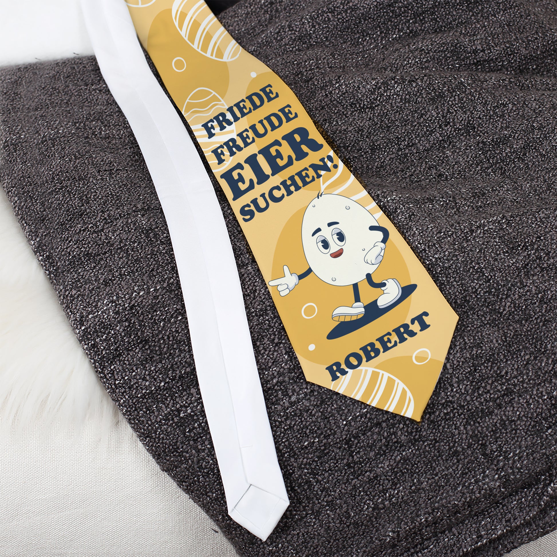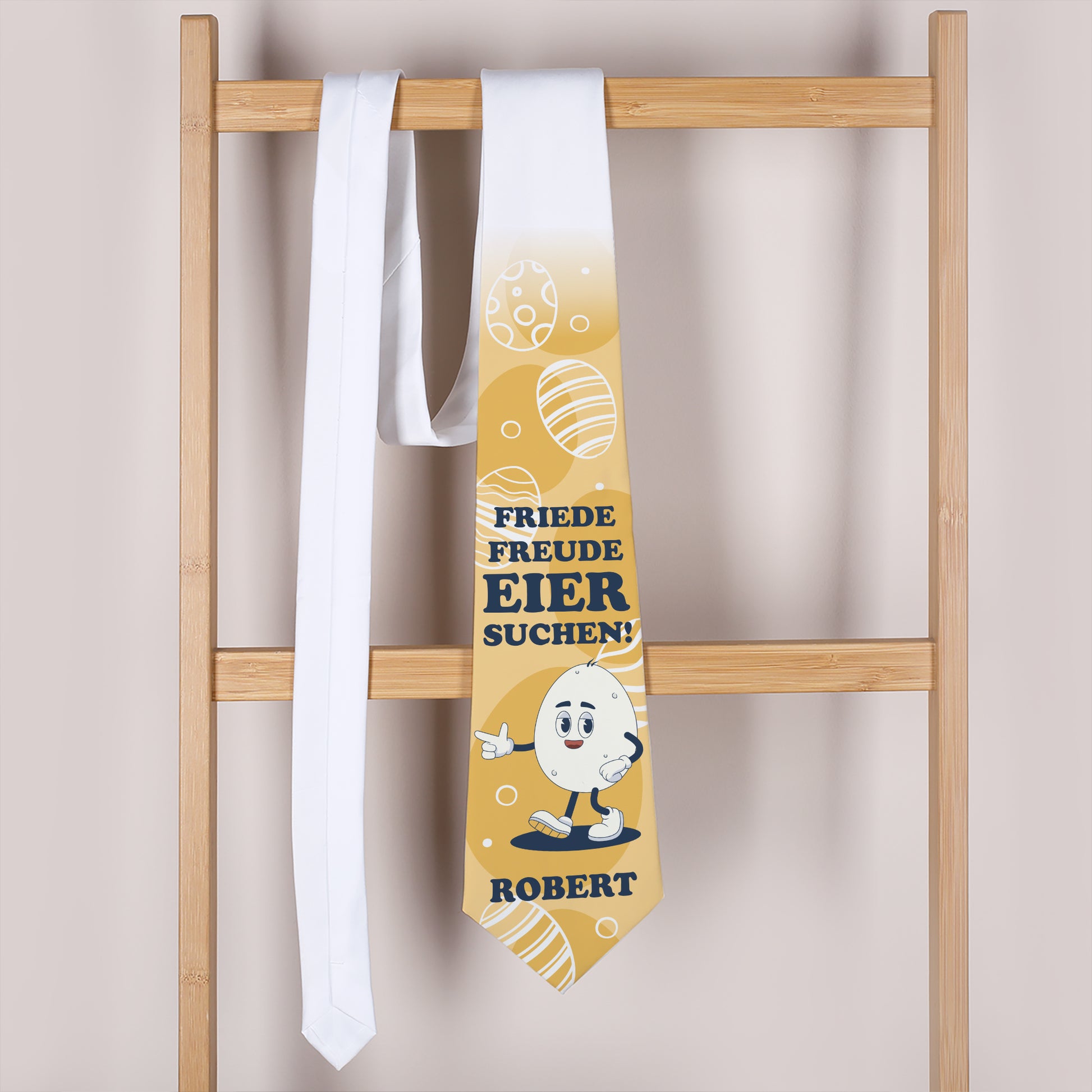 Oster-Krawatte mit Wunschname und Spruch „Friede, Freude, Eier suchen!“