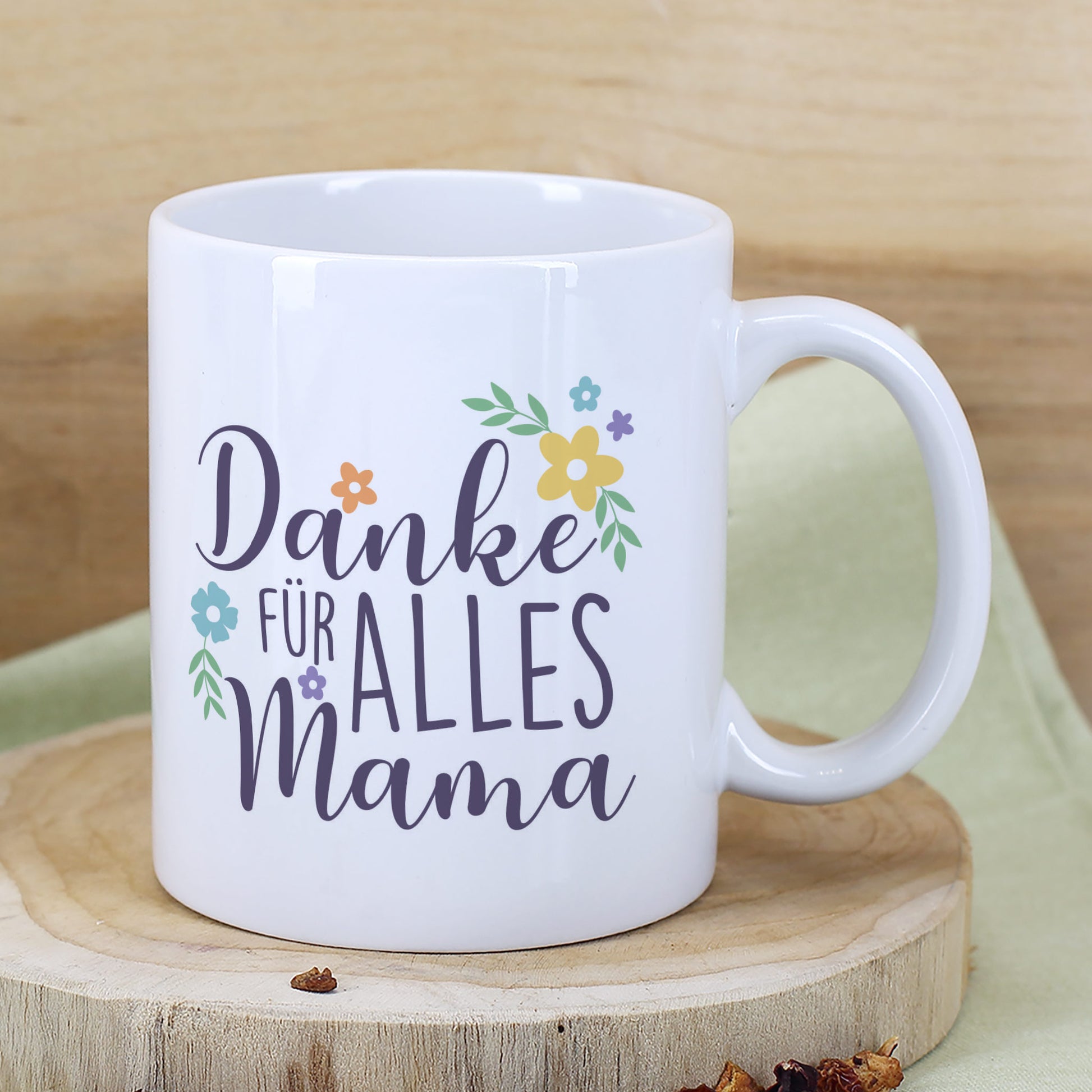 - Liebevoller Aufdruck: „Danke für alles Mama“ in floraler Optik