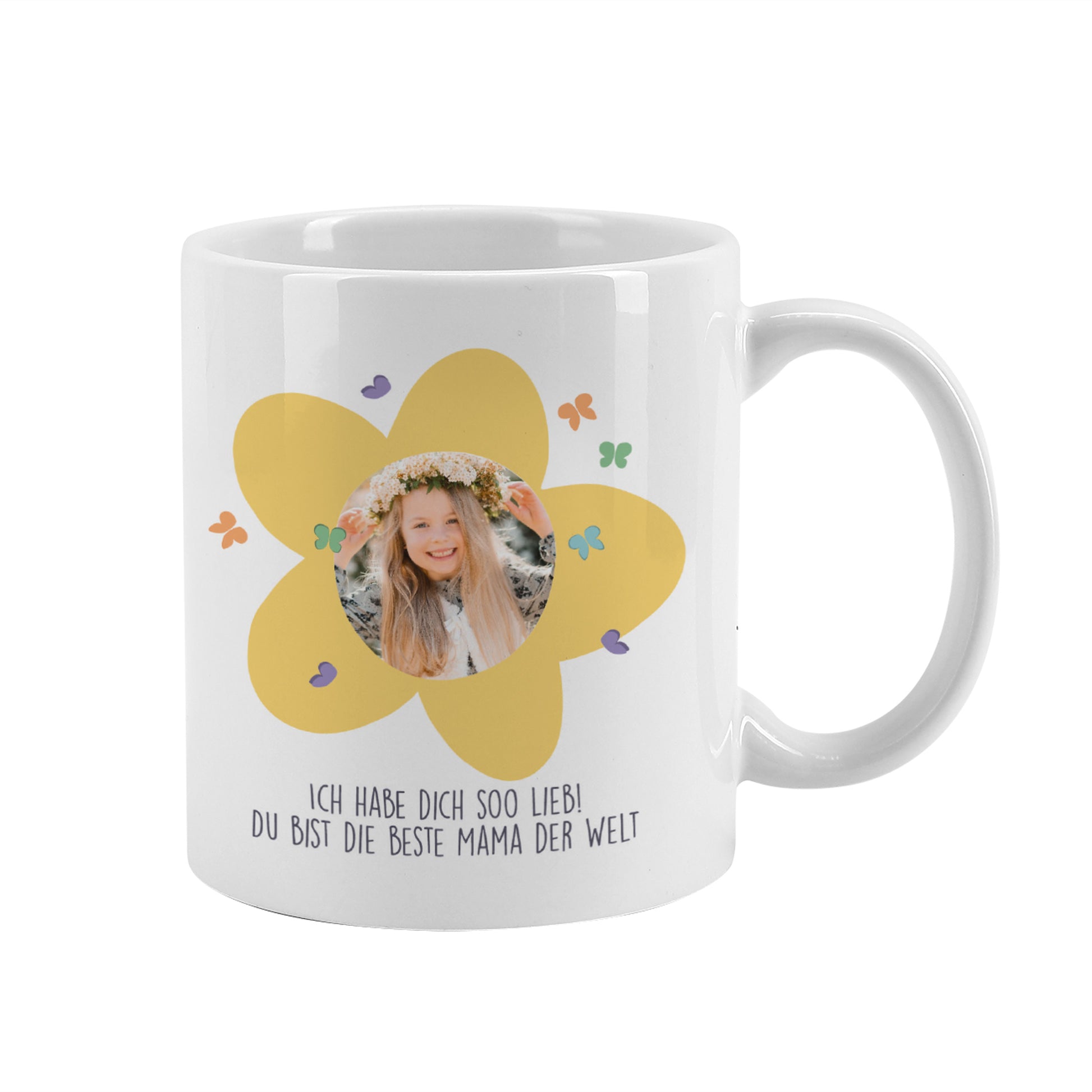 Die Vorderseite ist mit floraler Schrift und bunten Blüten verziert. Auf der Rückseite befindet sich ein großes gelbes Blütenmotiv, in das dein Lieblingsfoto eingebettet wird – umrahmt von kleinen Schmetterlingen in zarten Farben. Darunter findet dein Wunschtext Platz – ein kurzer Gruß, ein Name oder ein paar liebe Worte machen das Geschenk zu etwas ganz Besonderem.