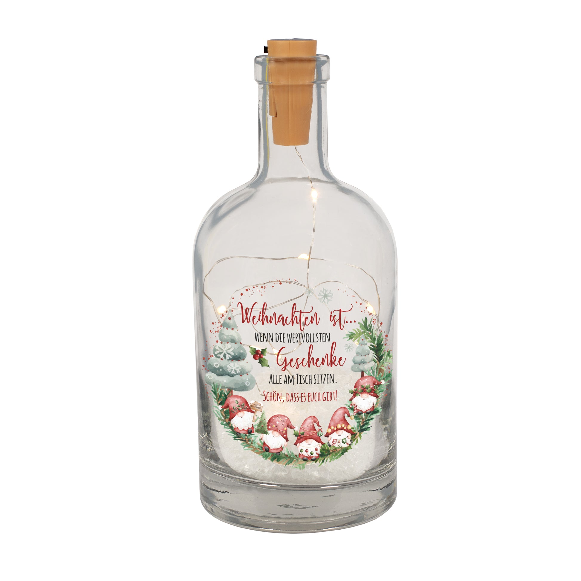 Diese liebevoll gestaltete Deko-Karaffe bringt weihnachtlichen Zauber direkt ins Zuhause. Das verspielte Wichtelmotiv mit verschneitem Tannenwald, Winterkranz und festlichem Schriftzug sorgt sofort für eine warme, gemütliche Stimmung. Im Inneren der Flasche befindet sich feiner Kunstschnee, der das winterliche Motiv atmosphärisch unterstreicht. Die integrierte LED-Lichterkette mit warmweißen Lichtpunkten lässt das Design stimmungsvoll erstrahlen und macht die Karaffe zu einem besonderen Blickfang auf Fensterbank, Esstisch, Sideboard oder im Eingangsbereich.