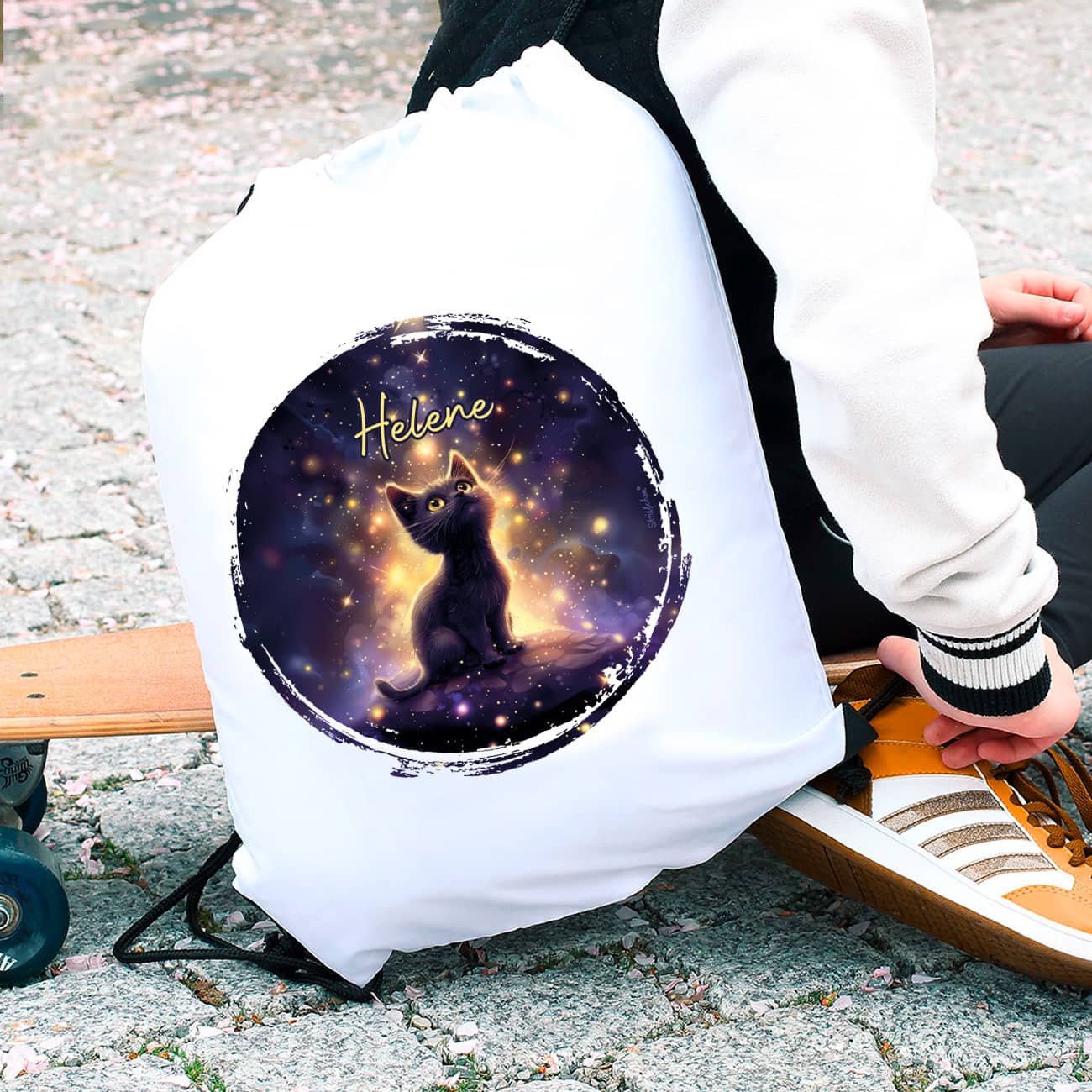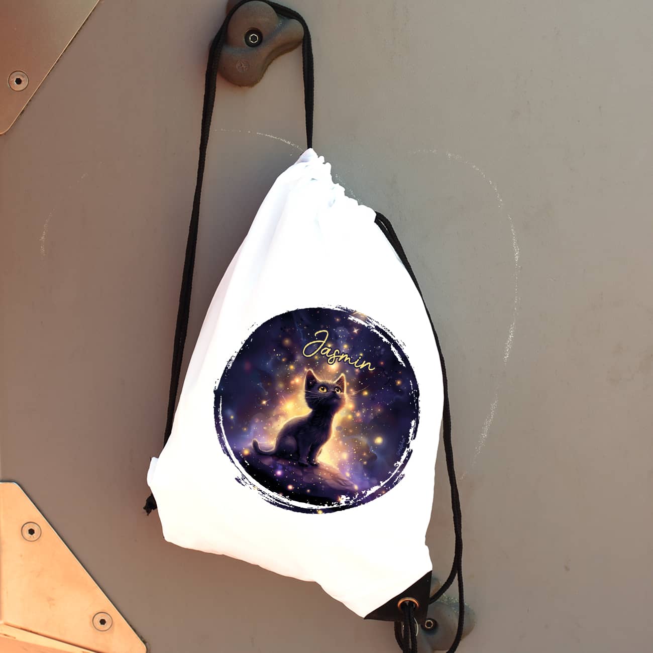 Bedruckter Turnbeutel mit magischem Katzenmotiv