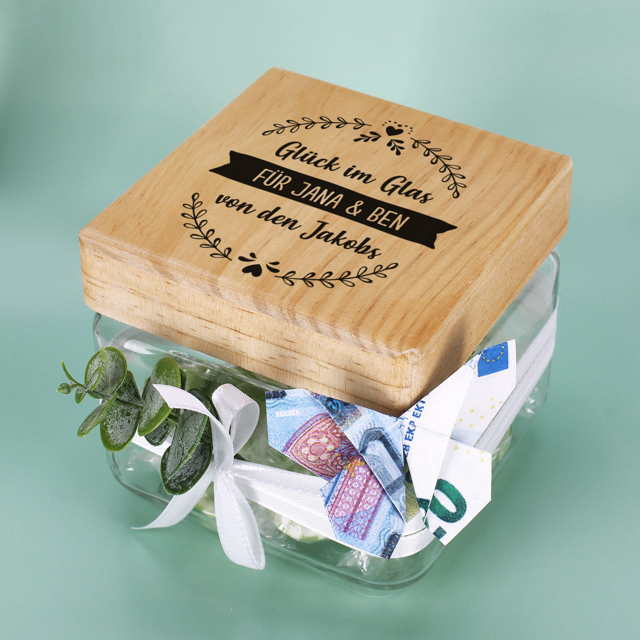 Entdecken Sie unser vielseitiges Vorratsglas mit einem stylischen Holzdeckel, das in vier verschiedenen Größen erhältlich ist! Mit der Option, das Glas mit drei Zeilen Text nach Wunsch zu bedrucken, bieten wir Ihnen die Möglichkeit, ein individuelles und persönliches Geschenk zu gestalten. Der Text wird dabei in einen ansprechenden Kranz eingefügt und kann ganz nach Ihren Vorstellungen angepasst werden. Unser Vorratsglas eignet sich hervorragend als Geschenk zum Einzug, Geburtstag oder für andere besondere Anlässe. Es ist nicht nur praktisch, sondern auch ästhetisch ansprechend und vielseitig einsetzbar.