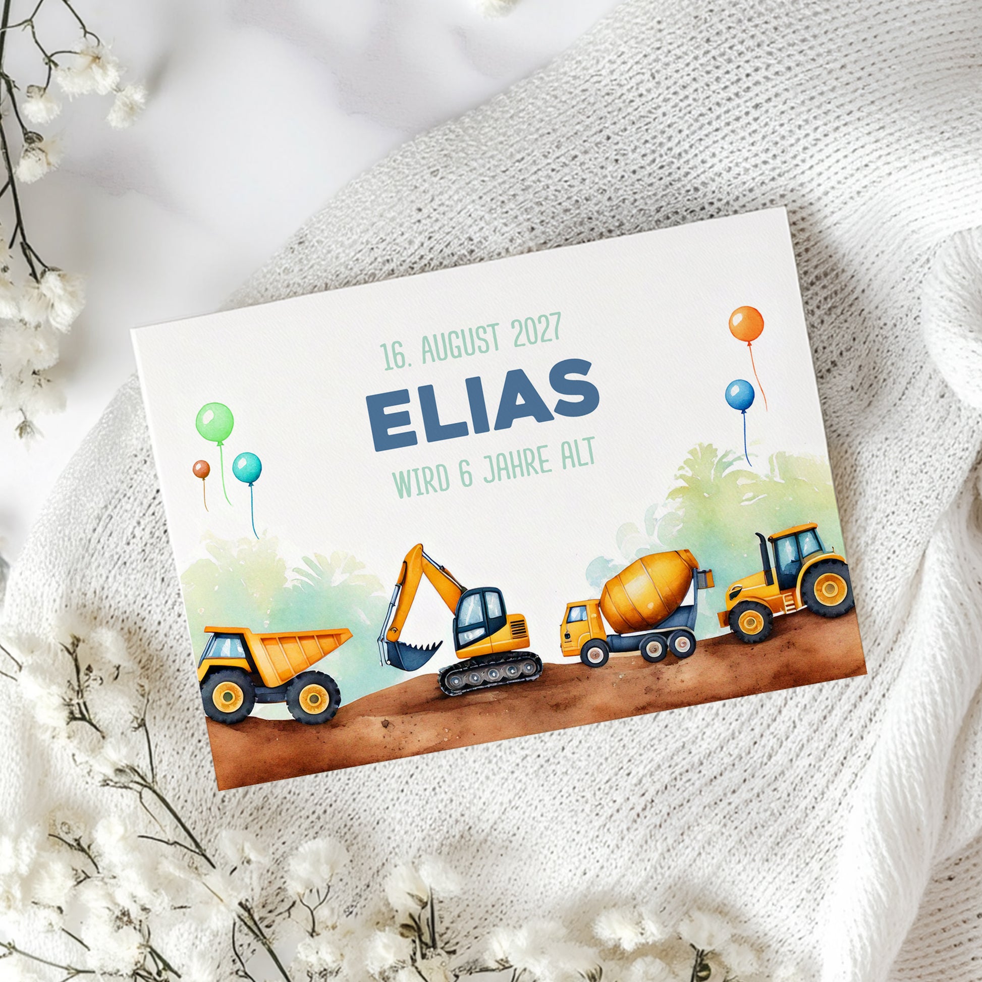 - Design: Aquarell-Illustration mit Baustellenfahrzeugen (Bagger, Kipper, Betonmischer, Traktor)