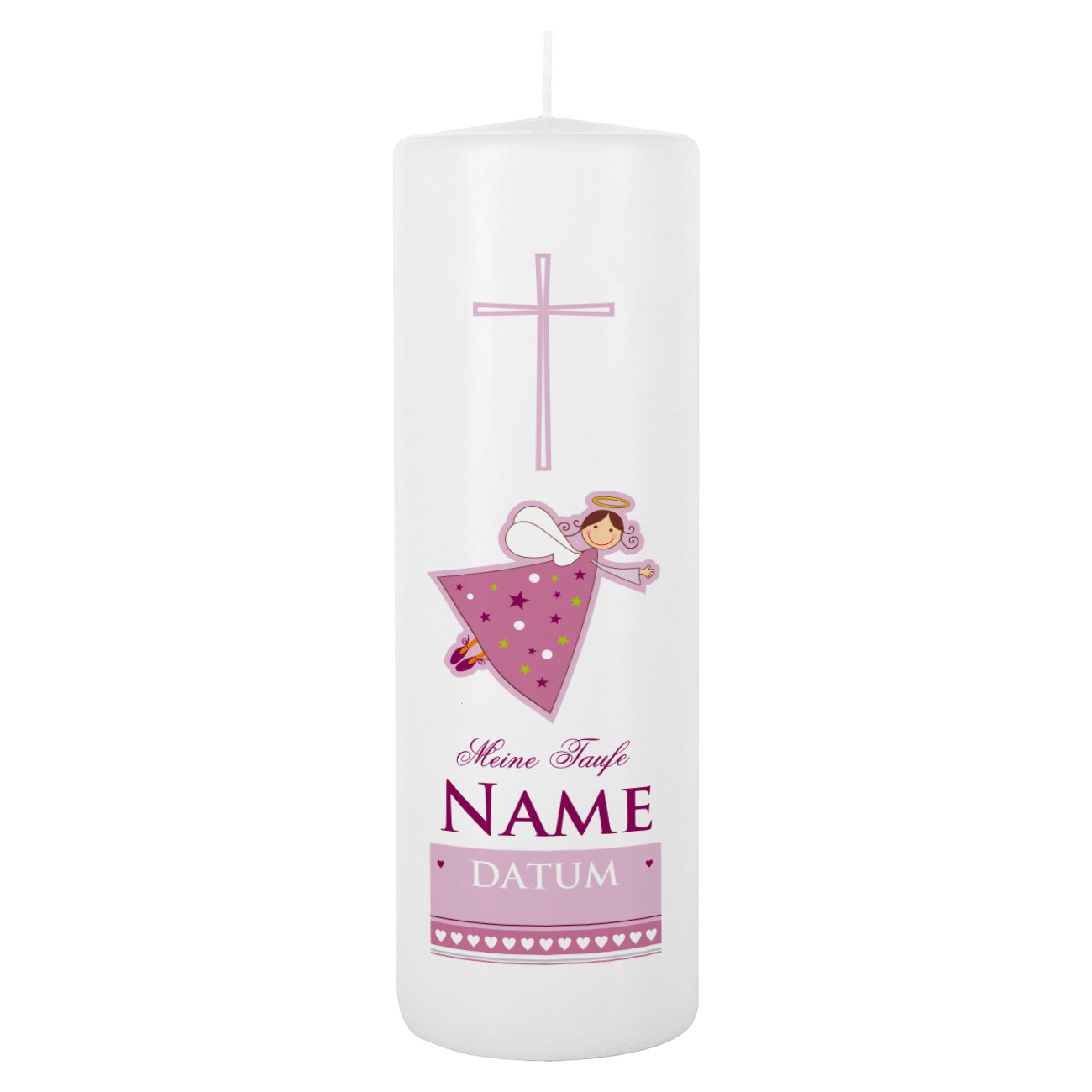 Die 25 cm hohe Stumpenkerze für Mädchen wird mit einem niedlichen Schutzengel verziert. Weiterhin ist der Text Meine Taufe, der Name des Kindes und das gewünschte Datum darauf zu lesen.