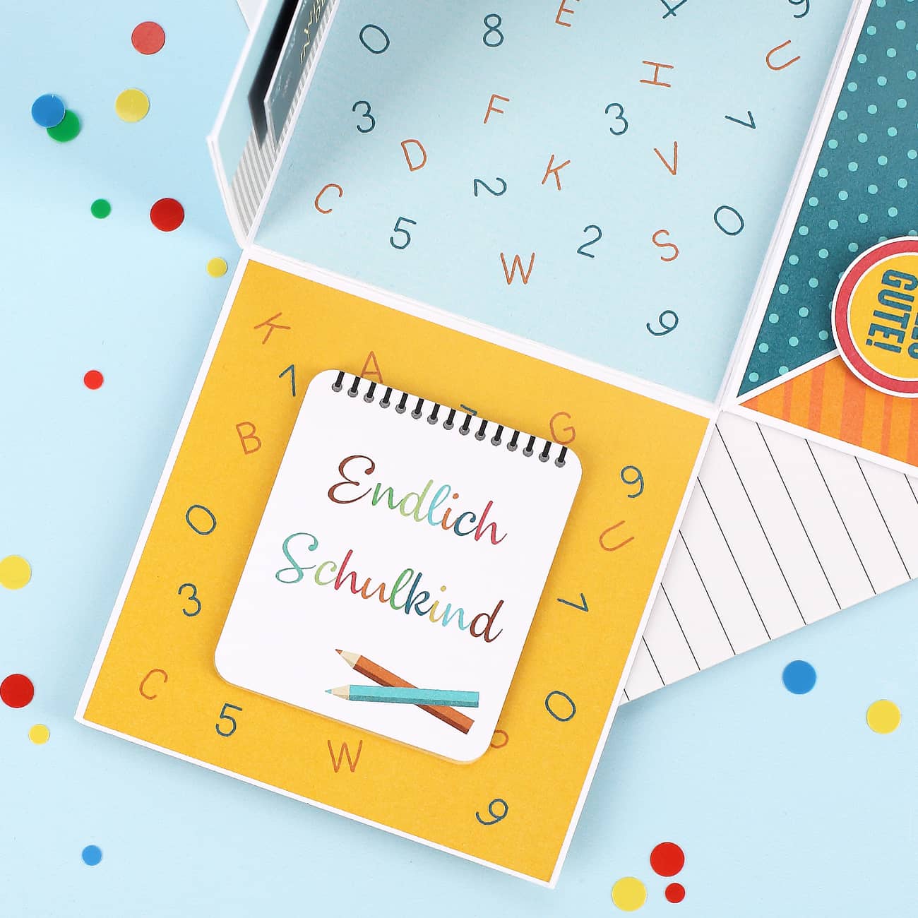 Die Überraschungsbox ist im Inneren im Stil eines Klassenzimmers gestaltet. Ganz Stilecht mit Tafeln und Lernbildern an der Wand. Eine Seite ist zu einer Tasche gefaltet in dem ein Stück Karton steckt, den Sie mit Glückwünschen beschreiben können. Eine kleine Applikation mit den Worten "Alles Gute" rundet dies ab. Auf der anderen Seitenlasche sieht man einen Notizblock mit der Aufschrift "Endlich Schulkind". All diese Apllikationen sind mit Abstandshaltern befestigt und ergeben so einen tollen 3D-Effekt.