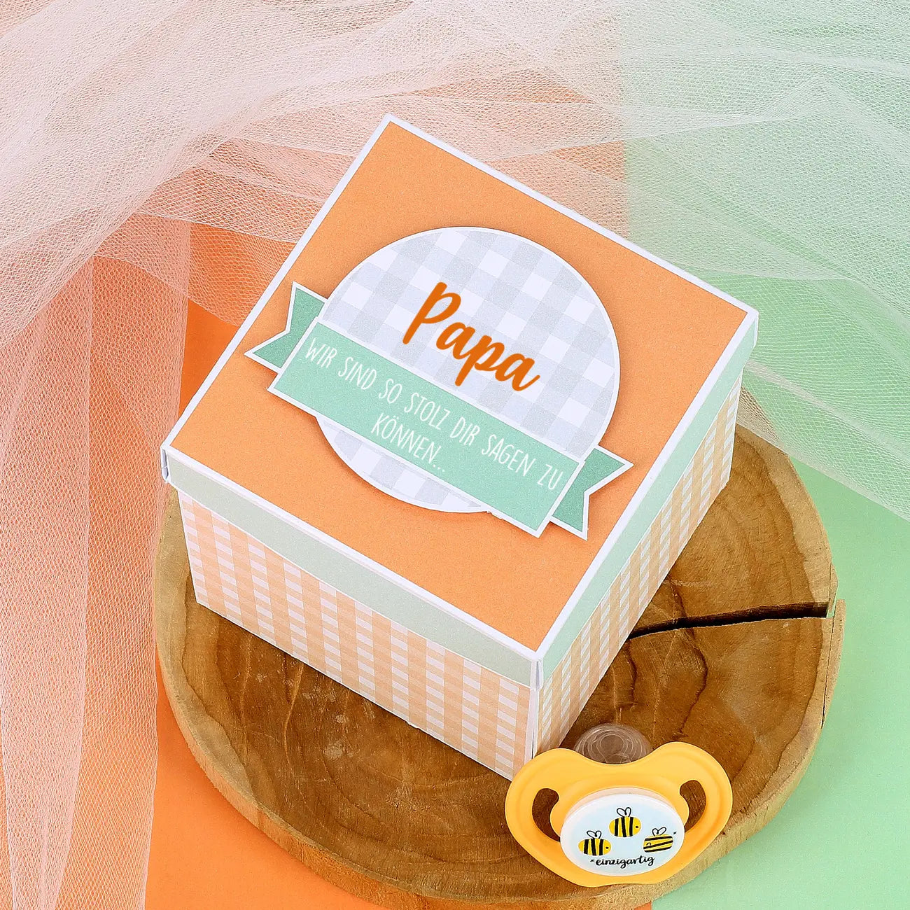 Die Box wird in liebevoller Handarbeit für Sie hergestellt. Außen ist sie ganz schlicht gestaltet. Ein Karomuster in einem sanften Orangeton ziert umlaufend die Box, der Deckel ist in einem hellen Mintton bedruckt. Oben auf den Deckel platzieren wir eine Applikation mit Abstandshaltern für einen besonderen 3D-Effekt. Darauf wird Ihr Wunschname gedruckt zusammen mit einem kurzen Wunschtext in dem mintfarbenen Banner. Hier können Sie Sätze wie "Du wurdest befördert" oder "Wir müssen dir was sagen..." eintragen oder Sie lassen Ihrer Kreativität freien Lauf. Für diesen kurzen Text stehen Ihnen 40 Zeichen zur Verfügung.