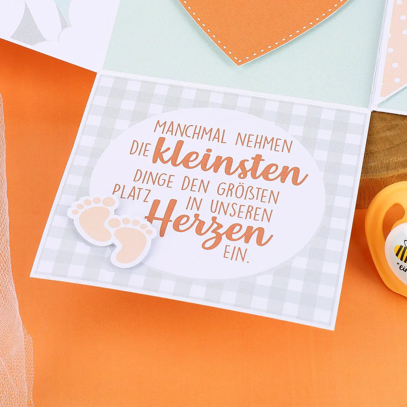 Sobald der Deckel der Box abgenommen wird, fallen alle vier Seitenwände um und geben das Innere preis. Auf dem Boden der Schachtel steht in einem großen orangene Herzen "Du wirst...". Ob für den werdenden Papa, die Oma, den Opa, die Tante oder den Onkel, je nachdem welche Variante Sie wählen wird das Herz im Inneren angepasst. An zwei anderen Seitenwänden befinden sich ein niedlicher Storch mit Baby im Schnabel und der Spruch "Manchmal nehmen die kleinsten Dinge den größten Platz in unseren Herzen ein.". Daneben platzieren wir ein paar kleine Babyfüßchen.