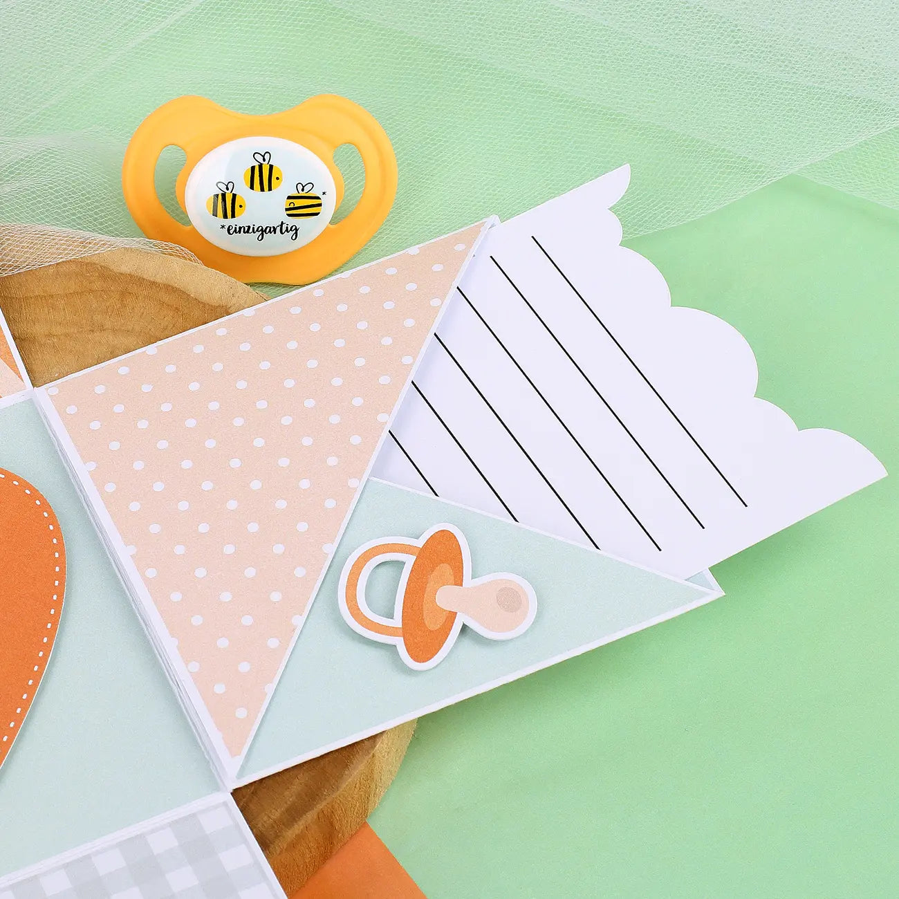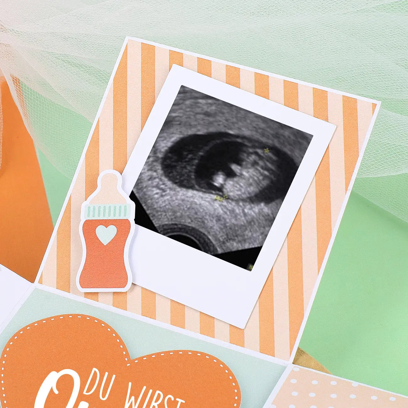 Eine Seitenwand wird zu einer Art Tasche gefaltet in der ein Stück Karton liegt den Sie ganz nach Belieben beschreiben können. Auf dieser Seitenwand wird ein kleiner Schnuller, ebenfalls mit Abstandshaltern, platziert. Auf der letzten Seitenwand ist ein kleiner Polaroidrahmen angebracht, den Sie mit einem Ultraschallbild, welches Sie selbst ausdrucken, bestücken können. Schieben Sie hierzu das Bild (mit den Maßen 5 cm x 5 cm) einfach von oben in den Rahmen, dieser besitzt eine Öffnung an der Oberkante. Dazu wird eine kleine Nuckelflasche auf den Rahmen platziert.