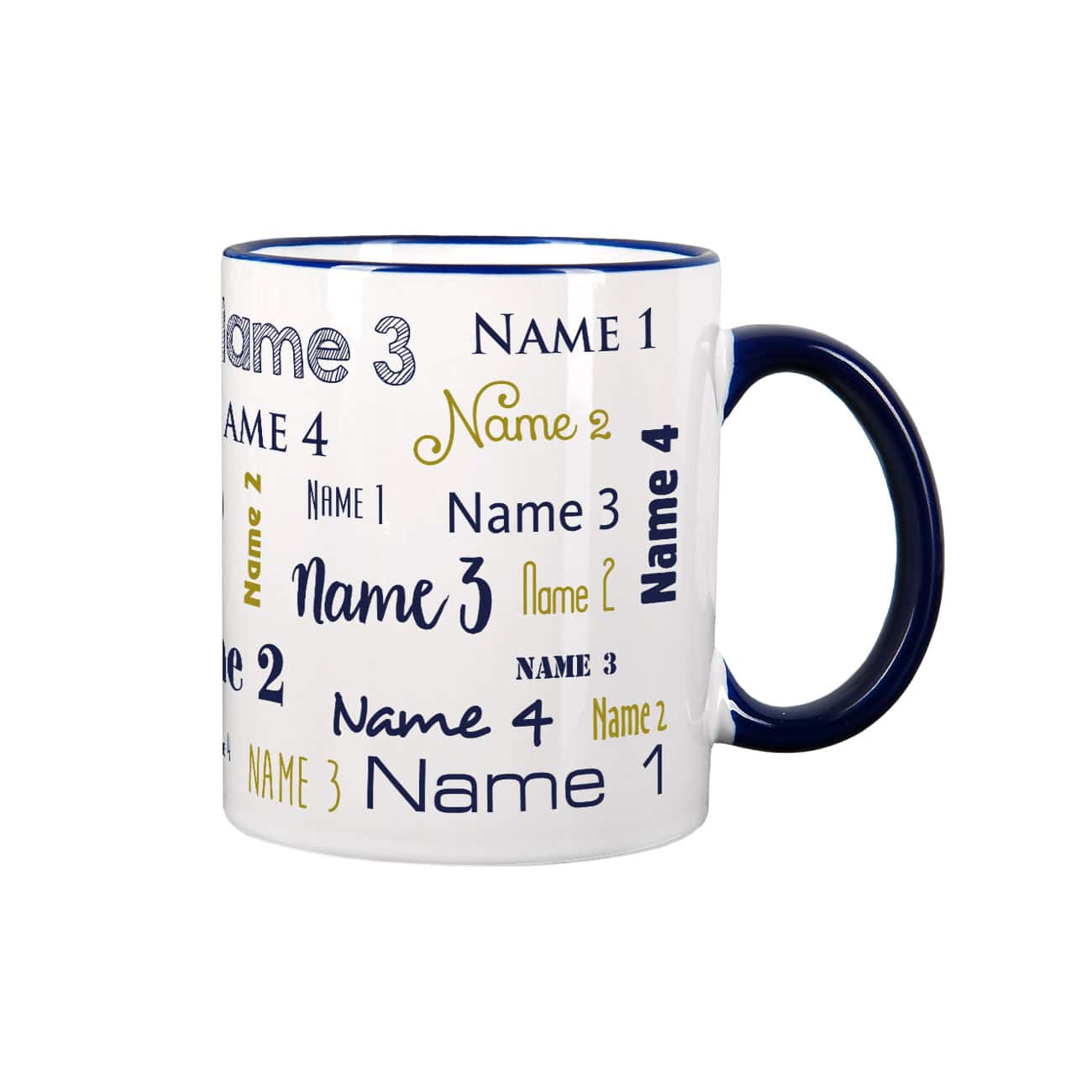 Als Geschenk für Arbeitskollegen oder Sportler können Sie anstelle der vier Namen den Vornamen, Familiennamen und den Vereins- oder Firmennamen eingeben. Aber auch eine kurze Botschaft findet auf dieser Tasse mit dunkelblauem Rand und Henkel Platz. Je nach Textlänge fällt der Aufdruck flächig oder weniger intensiv aus, wie Sie anhand der Beispiele sehen können.