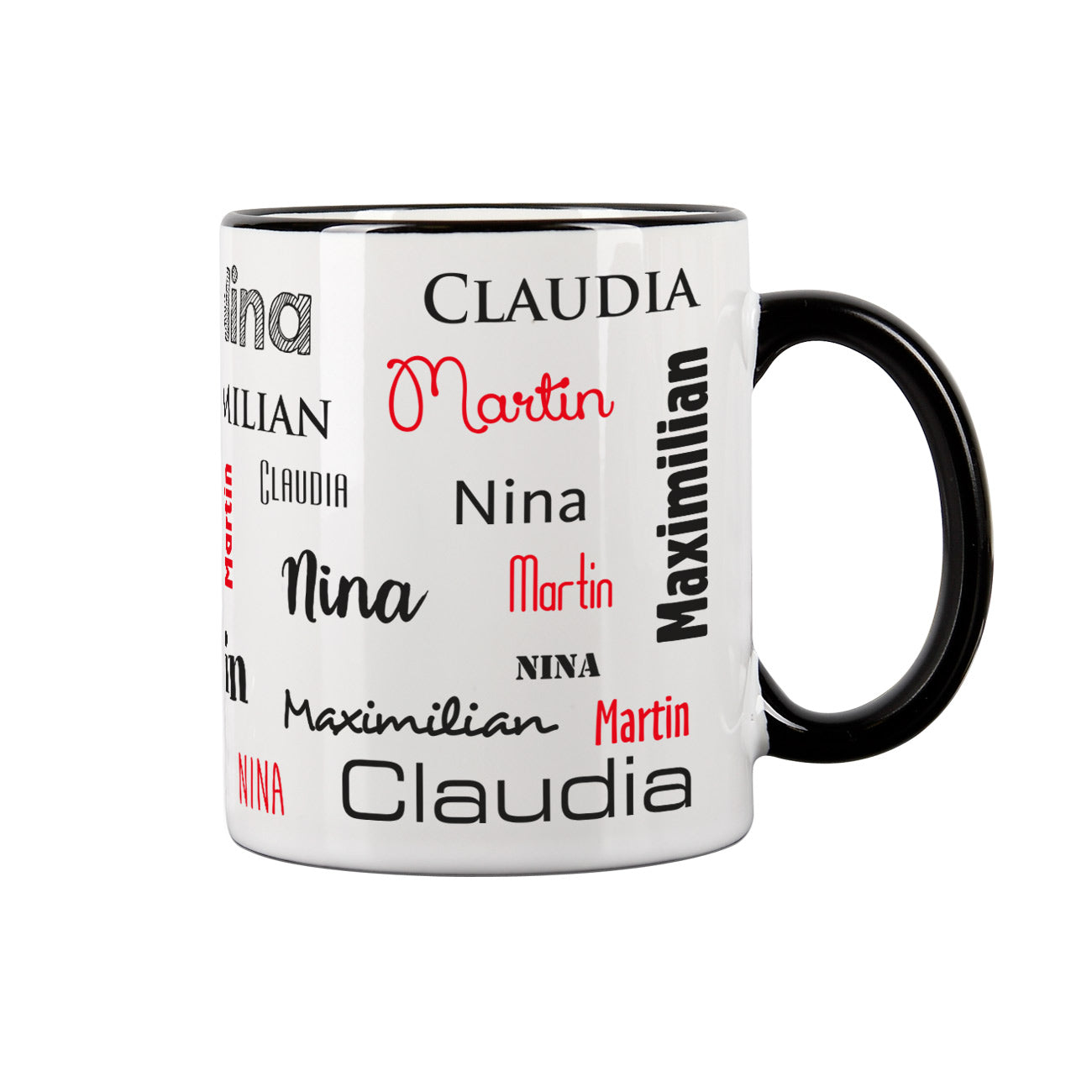 Diese Keramiktasse mit schwarzem Rand und Henkel, wird mit Ihren vier Wunschnamen zu einer bezaubernden Geschenkidee für Familien. Sie sorgt für noch mehr Freude am morgendlichen Frühstückstisch und ist darüber hinaus auch ein praktisches Geschenk fürs Büro.
