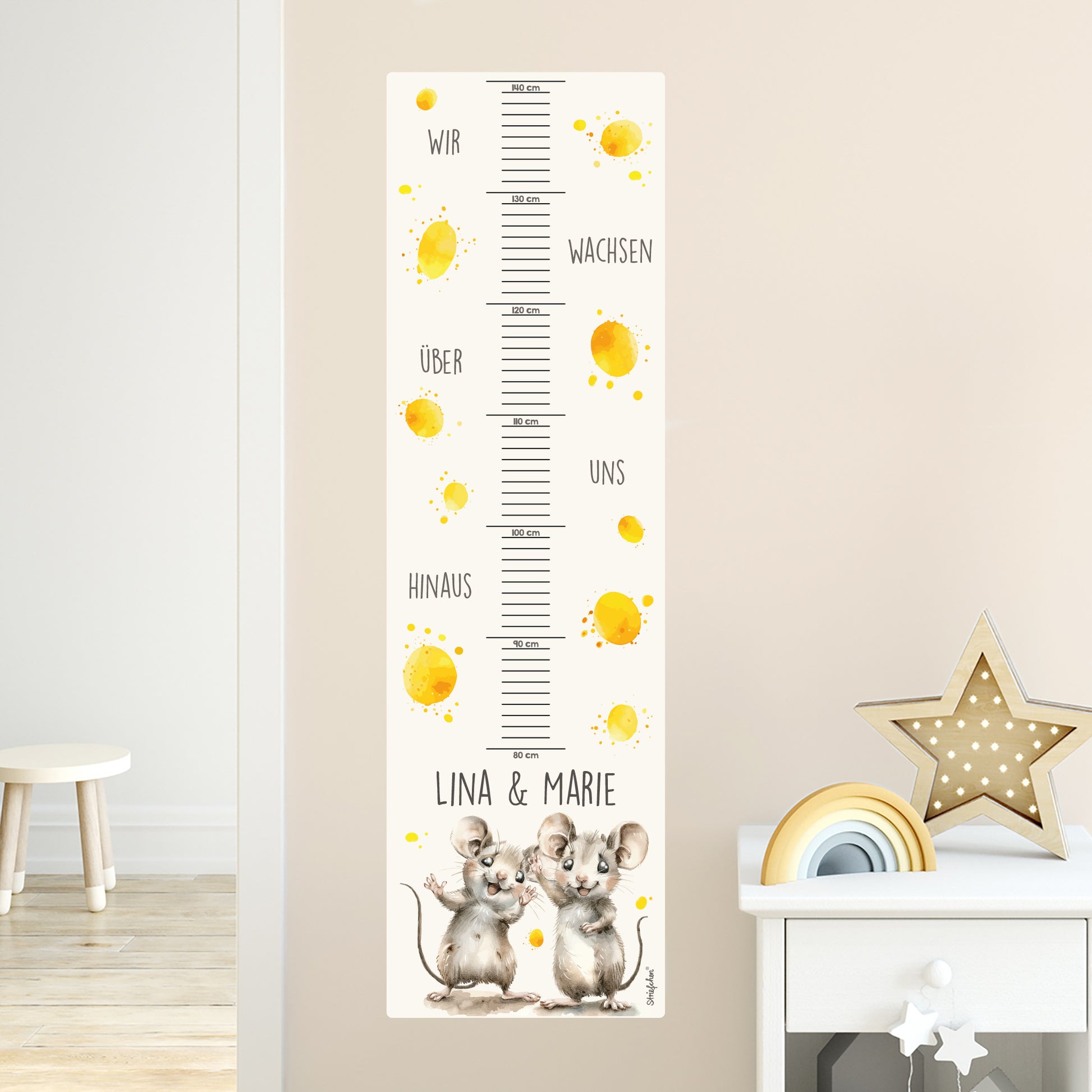 Diese Messlatte ist nicht nur ein praktisches Hilfsmittel, um das Wachstum zu dokumentieren, sondern auch eine wunderschöne Wanddekoration. Die Mäuse-Zwillinge mit ihren großen, neugierigen Augen bringen eine verspielte und liebevolle Atmosphäre ins Kinderzimmer. Dank des hochwertigen Drucks und der robusten Folie bleibt das Motiv lange erhalten und kann jederzeit problemlos entfernt oder versetzt werden.