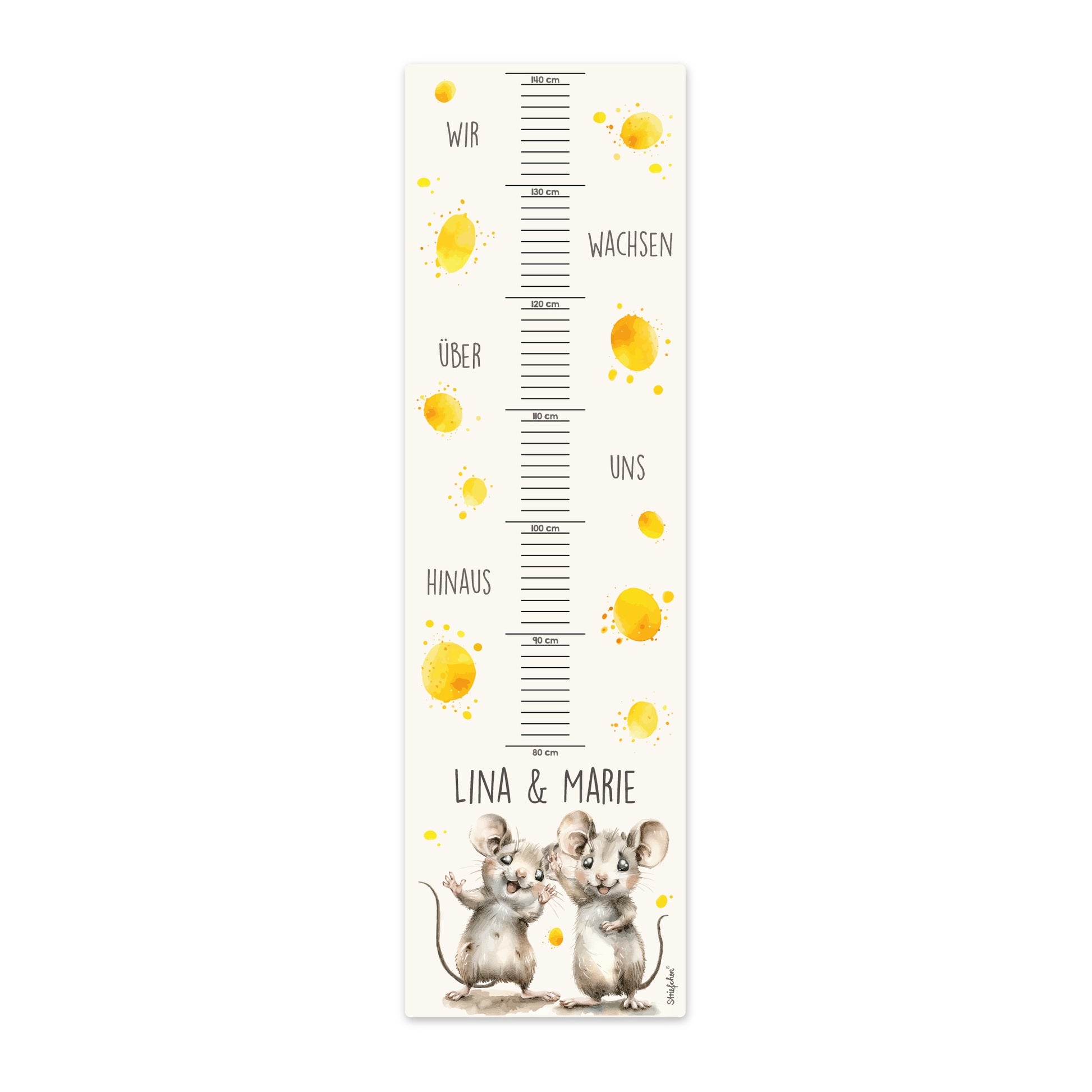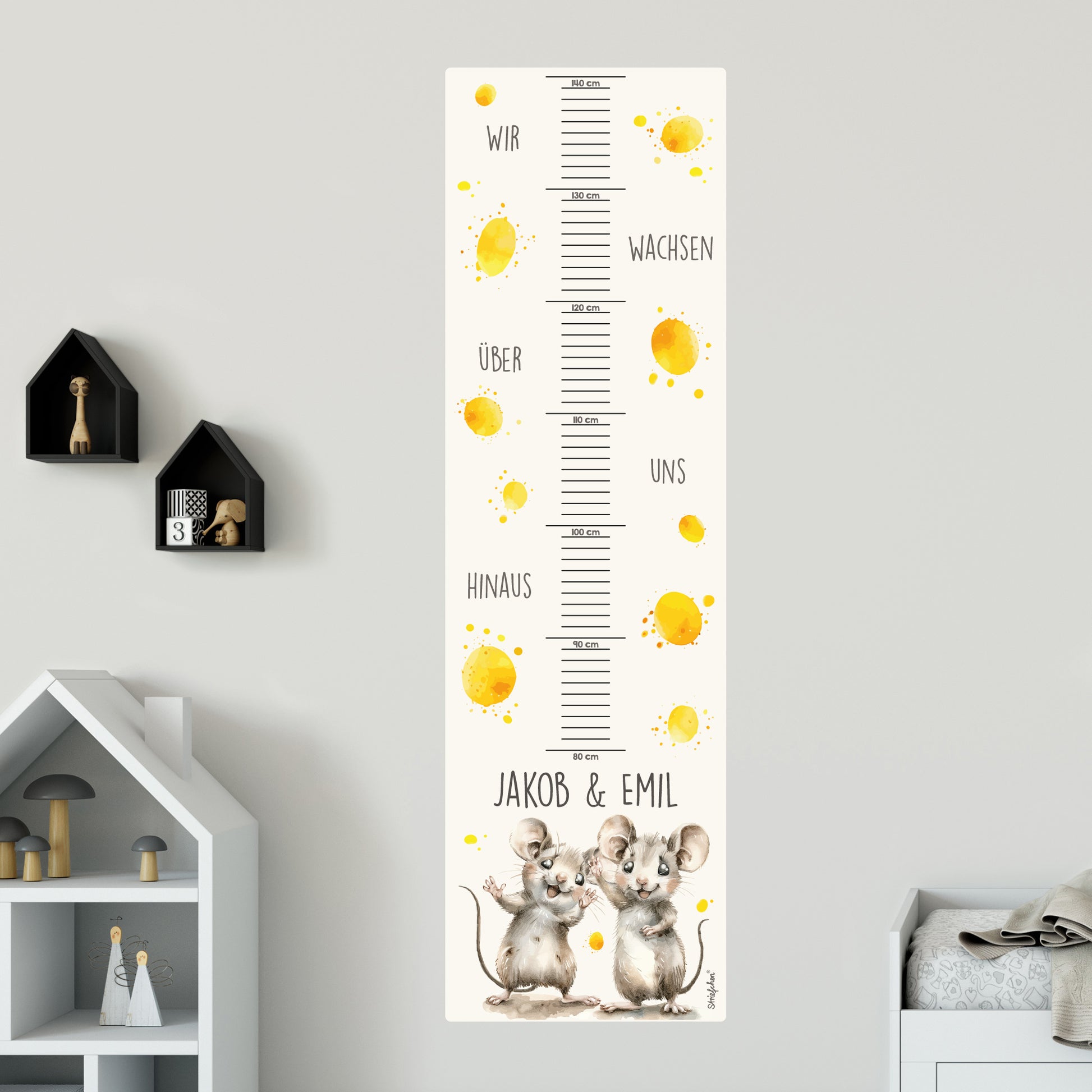 Diese bezaubernde Messlatte ist die perfekte Dekoration für das Kinderzimmer von Geschwistern oder Zwillingen. Zwei niedliche Mäuse klettern spielerisch die Wachstumsskala hinauf, während ihre Namen direkt über ihnen personalisiert werden. Der liebevolle Spruch „Wir wachsen über uns hinaus“ motiviert und begleitet die Kleinen auf ihrem Weg des Großwerdens.