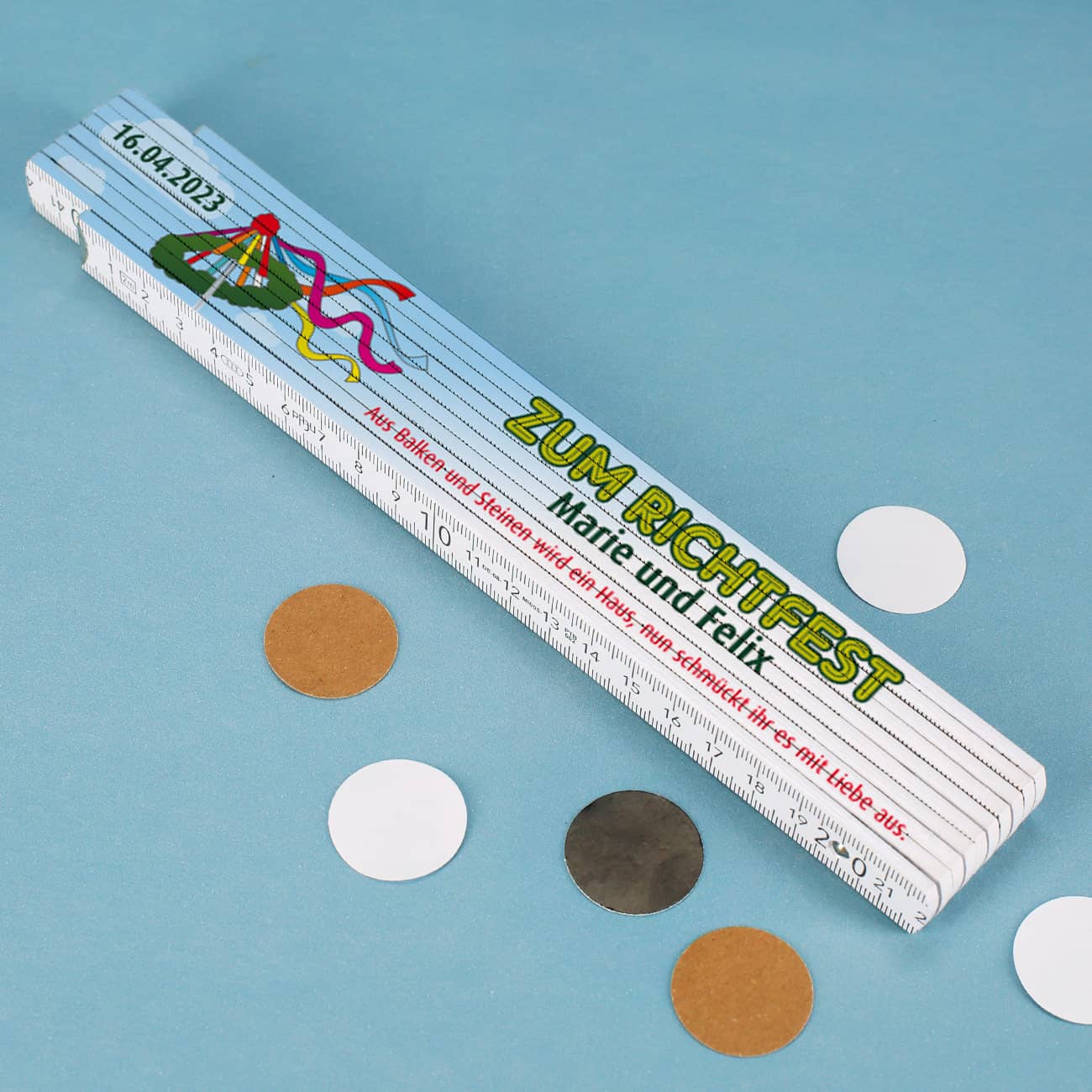 Mit diesem persönlichen Geschenk können die Bauherren schon zum Richtfest ihr Werkzeuglager aufstocken und haben so eine größere Chance im gewünschten Augenblick einen Maßstab zu finden. Natürlich macht der individuelle Aufdruck das Richtfest- Geschenk auch noch persönlich wertvoll. Ein Zollstock mit Personalisierung ist immer ein Unikat und ein tolles Geburtstagsgeschenk für Männer, ein einzigartiges Vatertagsgeschenk und ein lustiges Geschenk für zwischendurch.